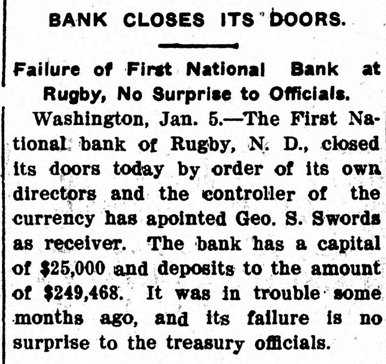 BANK CLOSES ITS DOORS. Failure of First National Bank at Rugby, No Surprise to Officials. Washington, Jan. 5.-The First National bank of Rugby, N. D., closed its doors today by order of its own directors and the controller of the currency has apointed Geo. S. Swords as receiver. The bank has a capital of $25,000 and deposits to the amount of $249,468. It was in trouble some months ago, and its failure is no surprise to the treasury officials.