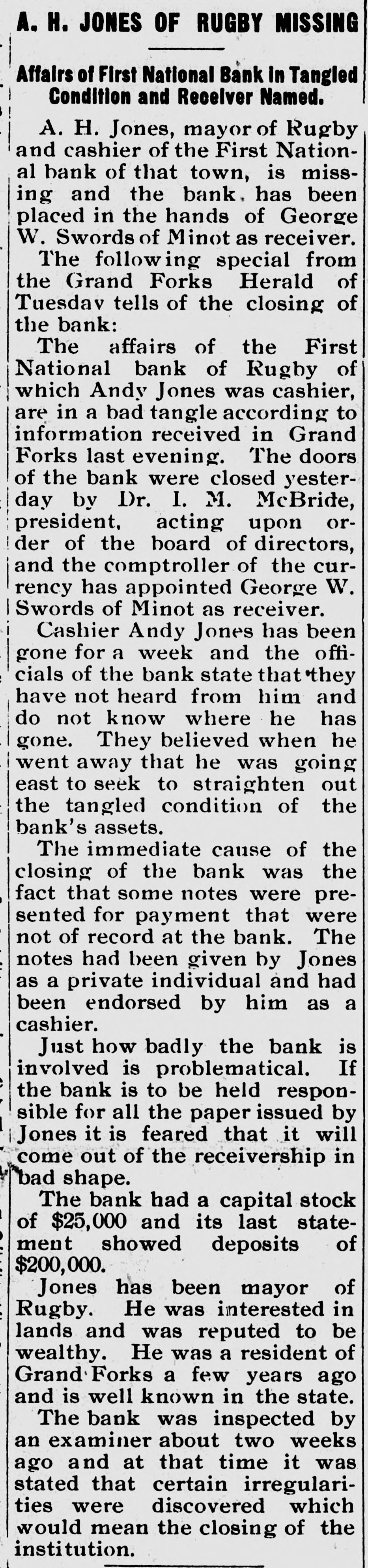 A. H. JONES OF RUGBY MISSING Affairs of First National Bank in Tangled Condition and Receiver Named. A. H. Jones, mayor of Rugby and cashier of the First National bank of that town, is missing and the bank. has been placed in the hands of George W. Swords of Minot as receiver. The following special from the Grand Forks Herald of Tuesdav tells of the closing of the bank: The affairs of the First National bank of Rugby of which Andy Jones was cashier, are in a bad tangle according to information received in Grand Forks last evening. The doors of the bank were closed yesterday by Dr. I. M. McBride, president, acting upon order of the board of directors, and the comptroller of the currency has appointed George W. Swords of Minot as receiver. Cashier Andy Jones has been gone for a week and the officials of the bank state that they have not heard from him and do not know where he has gone. They believed when he went away that he was going east to seek to straighten out the tangled condition of the bank's assets. The immediate cause of the closing of the bank was the fact that some notes were presented for payment that were not of record at the bank. The notes had been given by Jones as a private individual and had been endorsed by him as a cashier. Just how badly the bank is involved is problematical. If the bank is to be held responsible for all the paper issued by Jones it is feared that it will come out of the receivership in bad shape. The bank had a capital stock of $25,000 and its last statement showed deposits of $200,000. Jones has been mayor of Rugby. He was interested in lands and was reputed to be wealthy. He was a resident of Grand Forks a few years ago and is well known in the state. The bank was inspected by an examiner about two weeks ago and at that time it was stated that certain irregularities were discovered which would mean the closing of the institution.