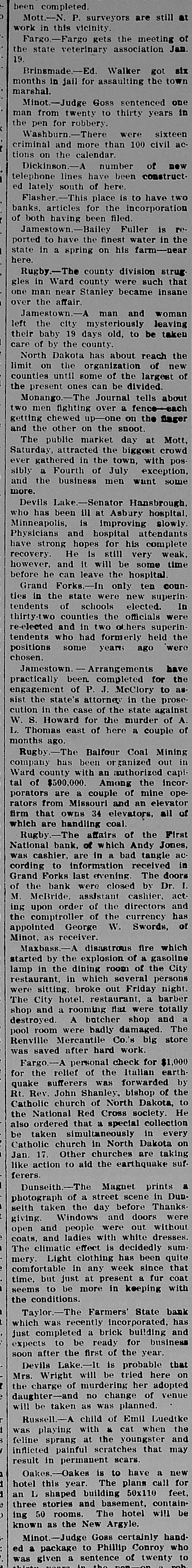 been completed. Mott.-N. P. surveyors are still at work in this vicinity Fargo-Fargo gets the meeting of the state veterinary association Jan. 61 XIS 102 Waller months in jail for assaulting the town marshal. auo serienced ssog man from twenty to thirty years in the pen for robbery Washburn.-There were sixteen criminal and more than 100 civil actions on the calendar мои 10 dequinu telephone lines have been constructed lately south of here. Flasher.-This place is to have two banks, articles for the incorporation of both having been filed Jamestown.-Bailey Fuller is reported to have the finest water in the state in a spring on his farm-near here Rugby.-The county division strug gles in Ward county were such that one man near Stanley became insane over the affair. Jamestown.-A man and woman left the city mysteriously leaving their baby 19 days old, to be taken care of by the county North Dakota has about reach the limit on the organization of new counties until some of the largest of the present ones can be divided Monango.-The Journal tells about e JOAO Supq8y иэш OM) getting chewed up-one on the finger and the other on the snoot The public market day at Mott, Saturday attracted the biggest crowd ever gathered in the town, with pos sibly a Fourth of July exception, and the business men want some more. Devils Lake-Senator Hansbrough, who has been ill at Asbury hospital, SIMOIS sp Physicians and hospital attendants have strong hopes for his complete recovery He is still very weak. however, and it will be some time before he can leave the hospital Grand Forks.-In only ten counties in the state were new superintendents of schools elected. In thirty-two counties the officials were re-elected and in two others superintendents who had formerly held the positions some years ago were chosen. Jamestown. Arrangements have practically been completed for the engagement of P. J. McClory to as sist the state's attorney in the prose cution in the case of the state against W S. Howard for the murder of A. jo couple B here 10 the Thonas "I months ago. Rugby -The Balfour Coal Mining company has been or ganized out in Ward county with an authorized capital of $500,000 Among the incorporators are a couple of mine operators from Missouri and an elevator JO 118 eleverors 18 SUMO that шлу which are handling coal Rugby.-The affairs of the First National bank, of which Andy Jones, was cashier. are in a bad tangle according to information received in Grand Forks last evening The doors of the bank were closed by Dr I. M McBride assistant cashier, act ing upon order of the directors and the comptroller of the currency has appointed George W. Swords, of Minot as receiver. Maxbass disastrous fire which started by the explosion of a gasoline lamp in the dining room of the City restaurant. in which several persons were sitting broke out Friday night The City hotel, restaurant a barber shop and a rooming flat were totally destroyed A butcher shop and a pool room were badly damaged. The Renville Mercantile Co.'s big store was saved after hard work Fargo.-A personal check for $1,000 for the relief of the Italian earth quake sufferers was forwarded by Rt. Rev John Shanley, bishop of the Catholic church of North Dakota, to the National Red Cross society. He also ordered that a special collection be taken simultaneously in every Catholic church in North Dakota on Jan 17. Other churches are taking like action to aid the earthquake sufferers Dunseith.-The Magnet prints a photograph of a street scene in Dunseith taken the day before Thanks giving. Windows and doors were open and people were out without coats, and ladies with white dresses The climatic effect is decidedly sum mery. Light clothing has been quite comfortable in any week since that time, but just at present a fur coat seems to be more in keeping with the conditions. Taylor.-The Farmers State bank which was recently incorporated has just completed a brick building and expects to be ready for business soon after the first of the year Devils Lake.-It is probable that Mrs. Wright will be tried here on the charge of murdering her adopted daughter-and no change of venue will be taken as was planned Russell.-A child of Emil Luedtke was playing with & cat when the feline sprang at the youngster and inflicted painful scratches that may STATE up result Oakes.-Oakes is to have a new hotel this year The plans call for an L shaped building 50x110 feet, three stories and basement, containing 50 rooms. The hotel will be known as the New Argyle. Minot.-Judge Goss certainly hand оцм Connoy Puttip 01 package E pe