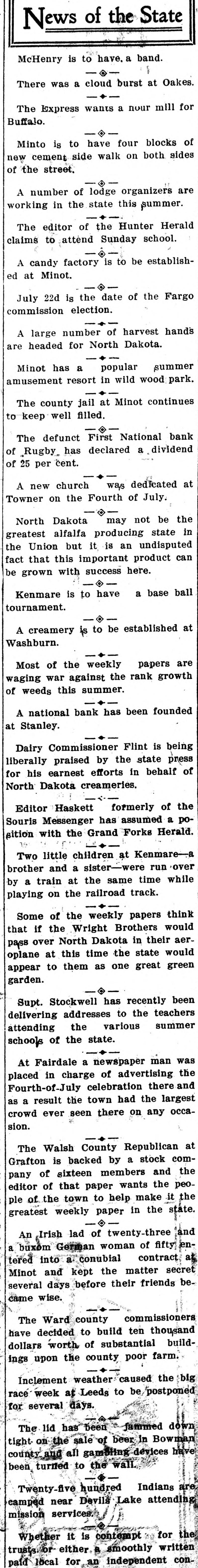 News of the State McHenry is to have. a band. There was a cloud burst at Oakes. The Express wants a nour mill for Buffalo. . Minto is to have four blocks of new cement side walk on both sides of the street. A number of lodge organizers are working in the state this summer. The editor of the Hunter Herald claims to attend Sunday school. A candy factory is to be established at Minot. July 22d is the date of the Fargo commission election. A large number of harvest hands are headed for North Dakota. Minot has a popular summer amusement resort in wild wood park. The county jail at Minot continues to keep well filled. The defunct First National bank of Rugby. has declared a dividend of 25 per cent. A new church was dedicated at Towner on the Fourth of July North Dakota may not be the greatest alfalfa producing state in the Union but it is an undisputed fact that this important product can be grown with success here. . Kenmare is to have a base ball tournament. A creamery is to be established at Washburn. Most of the weekly papers are waging war against the rank growth of weeds this summer A national bank has been founded at Stanley. Dairy Commissioner Flint is being liberally praised by the state press for his earnest efforts in behalf of North Dakota creameries. Editor Haskett formerly of the Souris Messenger has assumed a position with the Grand Forks Herald. Two little children at Kenmarebrother and a sister-were run over by a train at the same time while playing on the railroad track. Some of the weekly papers think that if the Wright Brothers would pass over North Dakota in their aeroplane at this time the state would appear to them as one great green garden. Supt. Stockwell has recently been delivering addresses to the teachers attending the various summer schools of the state. At Fairdale a newspaper man was placed in charge of advertising the Fourth-of-July celebration there and as a result the town had the largest crowd ever seen there on any occasion. The Walsh County Republican at Grafton is backed by a stock company of sixteen members and the editor of that paper wants the people of the town to help make it the greatest weekly paper in the state. An Irish lad of twenty-three and a buxom German woman of fifty entered into a. conubial contract at Minot and kept the matter secret several days before their friends became wise. The Ward county commissioners have decided to build ten thousand dollars worth of substantial buildings upon the county poor farm. Inclement weather caused the big race week at Leeds to be postponed for several days. The lid has been fammed down tight on the sale of beer in Bowman county and all gambling devices have been turned to the wall. Twenty five hundred Indians are camped near Devils Lake attending mission services. Whether it is contempt for the trusts or either a smoothly written local for independent con-
