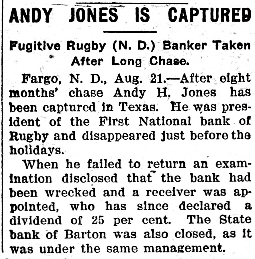 ANDY JONES IS CAPTURED Fugitive Rugby (N. D.) Banker Taken After Long Chase. Fargo, N. D., Aug. 21.-After eight months' chase Andy H. Jones has been captured in Texas. He was president of the First National bank of Rugby and disappeared just before the holidays. When he failed to return an examination disclosed that the bank had been wrecked and a receiver was appointed, who has since declared a dividend of 25 per cent. The State bank of Barton was also closed, as it was under the same management.