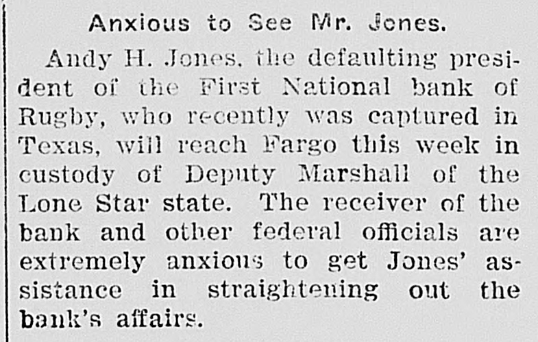 Anxious to See Mr. Jones. Andy H. Jones. the defaulting president of the First National bank of Rugby, who recently was captured in Texas, will reach Fargo this week in custody of Deputy Marshall of the Lone Star state. The receiver of the bank and other federal officials are extremely anxious to get Jones' assistance in straightening out the bank's affairs.