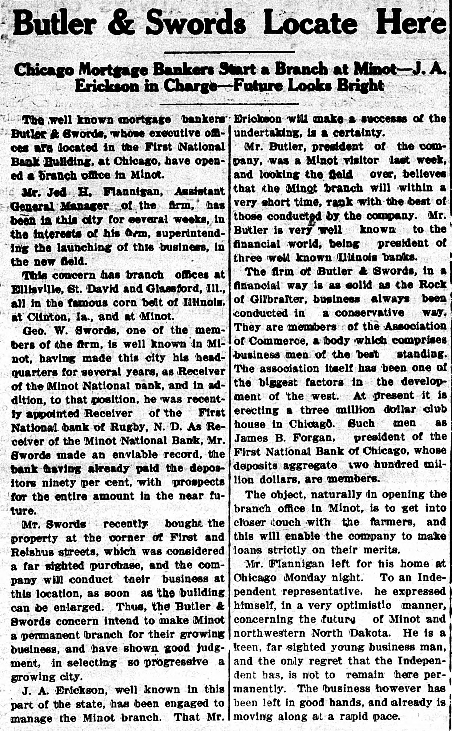 Butler & Swords Locate Here Chicago Mortgage Bankers Start a Branch at Minot-J. Erickson in Charge-Future Looks Bright The well known mortgage bankers Erickson will make a successs of the undertaking, is a certainty. Butler & Swords, whose executive offiMr. Butler, president of the comces are docated in the First National pany, was a Minot visitor last week, Bank Building, at Chicago, have openand looking the field over, believes ed & branch office in Minot. that the Minot branch will within a Mr. Jed H. Flannigan, Assistant very short time, rank with the best of General Manager of the firm, has those conducted by the company. Mr. been in this city for several weeks, in Butler is very well known to the the interests of his from, superintendfinancial world, being president of ing the launching of this business, in three well known Illinois banks. the new field. The firm of Butler & Swords, in a This concern has branch offices at financial way is as solid as the Rock Ellisville, St. David and Glassford, III, of Gilbralter, business always been all in the famous corn belt of Illinois, conducted in a conservative way. at Clinton, Ia., and at Minot. They are members of the Association Geo. W. Swords, one of the memof Commerce, a body which comprises bers of the firm, is well known in Mibusiness men of the best standing. not, having made this city his headThe association itself has been one of quarters for several years, as Receiver the biggest factors in the developof the Minot National bank, and in adment of 'the west. At present it is dition, to that position, he was recenterecting a three million dollar club ly appointed Receiver of the First house in Chicago. Such men as National bank of Rugby, N. D. As ReJames B. Forgan, president of the ceiver of the Minot National Bank, Mr. First National Bank of Chicago, whose Swords made an enviable record, the deposits aggregate two hundred milbank fhaving already paid the deposlion dollars, are members. itors ninety per cent, with prospects The object, naturally in opening the for the entire amount in the near fubranch office in Minot, is to get into ture. closer touch with the farmers, and Mr. Swords recently bought the this will enable the company to make property at the corner of First and loans strictly on their merits. Reishus streets, which was considered Mr. Flannigan left for his home at a far sighted purchase, and the comOhicago Monday night. To an Indepany will conduct their business at pendent representative, he expressed this location, as soon as the building himself, in a very optimistic manner, can be enlarged. Thus, the Butler & concerning the futury of Minot and Swords concern intend to make Minot northwestern North Dakota. He is a a permanent branch for their growing keen, far sighted young business man, business, and have shown good judgand the only regret that the Indepenment, in selecting so progressive a dent has, is not to remain here pergrowing city. manently. The business however has J. A. Erickson, well known in this been left in good hands, and already is part of the state, has been engaged to moving along at a rapid pace. manage the Minot branch. That Mr.