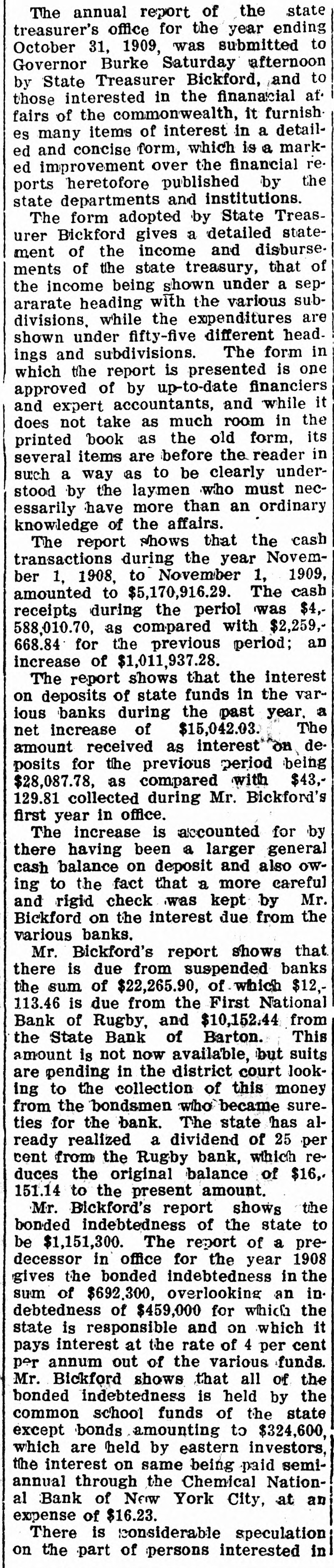 The annual report of the state treasurer's office for the year ending October 31, 1909, was submitted to Governor Burke Saturday afternoon by State Treasurer Bickford, and to those interested in the finanacial af: fairs of the commonwealth, it furnish es many items of interest in a detailed and concise form, which is a marked improvement over the financial reports heretofore published by the state departments and institutions. The form adopted by State Treasurer Bickford gives a detailed statement of the income and disburse. ments of the state treasury, that of the income being shown under a separarate heading with the various subdivisions, while the expenditures are shown under fifty-five different headings and subdivisions. The form in which the report is presented is one approved of by up-to-date financiers and expert accountants, and while it does not take as much room in the printed book as the old form, its several items are before the reader in such a way as to be clearly understood by the laymen who must necessarily have more than an ordinary knowledge of the affairs. The report shows that the cash transactions during the year November 1, 1908, to November 1, 1909, amounted to $5,170,916.29. The cash receipts during the periol was $4,588,010.70, as compared with $2,259,668.84 for the previous period; an increase of $1,011,937.28. The report shows that the interest on deposits of state funds in the various banks during the past year. a The net increase of $15,042.03. amount received as interest on deposits for the previous period being $28,087.78, as compared with $43,129.81 collected during Mr. Bickford's first year in office. The increase is accounted for by there having been a larger general cash balance on deposit and also owing to the fact that a more careful and rigid check was kept by Mr. Bickford on the interest due from the various banks. Mr. Bickford's report shows that there is due from suspended banks the sum of $22,265.90, of which $12,113.46 is due from the First National Bank of Rugby, and $10,152.44 from the State Bank of Barton. This amount is not now available, but suits are pending in the district court looking to the collection of this money from the bondsmen who became sureties for the bank. The state has already realized a dividend of 25 per rent from the Rugby bank, which reduces the original balance of $16,. 151.14 to the present amount. Mr. Bickford's report shows the bonded indebtedness of the state to be $1,151,300. The report of a predecessor in office for the year 1908 gives the bonded indebtedness in the sum of $692.300, overlooking an indebtedness of $459,000 for which the state is responsible and on which it pays interest at the rate of 4 per cent per annum out of the various funds. Mr. Bickford shows that all of the bonded indebtedness is held by the common school funds of the state except bonds amounting to $324,600, which are held by eastern investors, the interest on same being paid semiannual through the Chemical National Bank of New York City, at an expense of $16.23. There is considerable speculation on the part of persons interested in