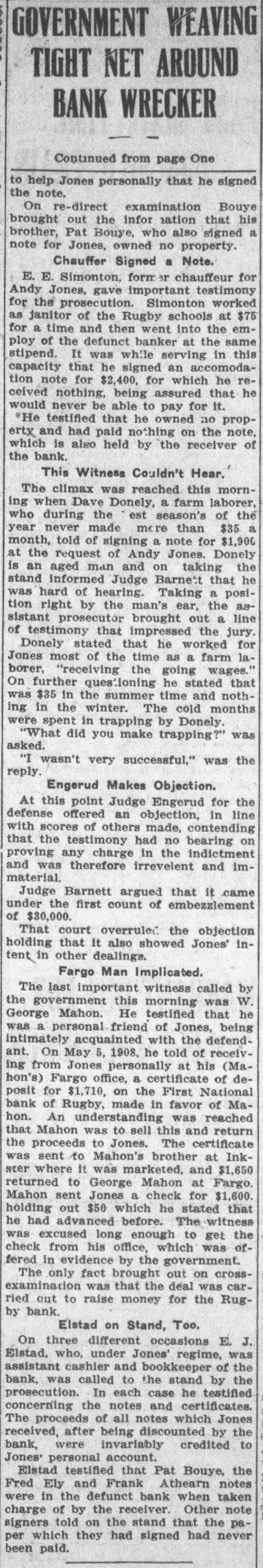 Continued from Page One. cashier of the bank, he stated that t) Ely in note and the Ely-Hall note we the First National bank of Rugl when the receiver took possession at never had been paid. Another Fraudulent Note The last witness called by Ass Dist. Atty. W. H. Barnett before tl noon recess was Atty. P. J. McClory Devils Lake, signer of an "accomm dation" note for $2,000. He stated substance on the stand: "On March 27, 1908, I was call over the long-distance telephone Rugby, I thing Mr. Elstad was ti person talking. I was told to come the First National bank. When I à rived I saw Elstad, who directed n Jones. to the directors' room where I m "Jones told me that the other tv banks were trying to make trouble f his bank, through runs I believe. I asked me to sign an accommodati note for $2,000, promising that I wou never have to pay it and that would be returned to me, after th had been tided over the trouble. received a written receipt in the han presence." writing of A. H. Jones, written in n At this point he exhibited the r ceipt which acknowledged the no and agreed that it would be return to him without payment. This w ment. offered in evidence by the gover On cross examination he stated th he had known Jones probably t years, that they were friendly. T attorney for the defense also broug out that he had signed a similar no for the Burton State bank, for whi he had received no consideration. T1 wards. was negotiated a few months afte Assistant Cashier Elstad was jt seated in the witness chair when Jud Amidon announced the noon rece Bankers on the Stand, The first witness called this morni by the government was E. J. Ritcl of the German-American National ba of Little Falls, Minn. He told of di counting the following notes for First National Bank of Rugby: E. I stad, $1,000; Dave Donely, $2,500; Q. Roar. $1,000. All of these he stat were finally paid. The defense waived cross examin tion of this witness. A series of chec payable to the German-American ba were then identified by Elstad. Elstad Not Cross Examined When this witness completed 1 identification, Judge Barnett annour ed that he had finished for the pros cution. Elstad has been on the sta eight times during the past two da Prior to this an agreement was read ed to conduct the cross examinati all at one time. He was now curr over to the defense, but by motion 11 cross-examination was postponed. Nels M. Evanson of the First Natio al Bank of Osakis was called and to of accepting a note signed by in Storck and Guerin of Brainerd, Min n in place of certain notes held by hi which had been purchased by Jon Jones' Official Position, From the minutes and Assista Cashier Elstad, Andy Jones' office position was established. It was sho that during all the time questi that he had held the office of cash and general manager of the First N tional Bank of Rugby and that he h stitution. entire charge of the affairs of that to The Bankers' Position. in 0There is probably over a dozen bar a ers from all over the northwest atter 1 ee ing the trial as witnesses, having ed some dealings with Andy Jones. eThe Forum this morning one of most prominent members said: is It is doubtful if any-at least vi nd few-of the banks buying the no offered by the First National ba ne of Rugby should be censured for ice ing SO, as they exercised ordin res se, business caution in purchasing paper. Many of them have alre been reimbursed and some of th are secured in other ways. The me ods of this banker were so audaci an that even some of the most car its financiers were deceived, but t in have taken every possible step to I ntect themselves and the patrons ill their institutions. The situation he such that there, should be no app the hension on the part of those hav interests in any of the instituti ent which may at one time have purch ored this alleged fraudulent paper. Friday Afternoon. That Andy H. Jones, ex-cashier 9 the defunct First National bank Rugby, N.-D., used. the credit of . institution which he represented raising over $34,780 which when ceived was applied to his personal count, was the main feature of the timony offered in sthe federal e Friday afternoon in the case of government against A. H. Jones. With bankers here from all over northwest; financiers who head strongest institutions in this section the country, who dealt with the Ru banker during his meteoric career in Fargo, a half dozen having testi That Jones' manipulations are wordbox of credit, the class where they long, was verdict of the crowd of si tators that thronged the court ro With the seldom frequented p crowed to its capacity, Judge Cha F. Amidon stationed bailiffs at e door, refusing admittance to all cept witnesses or jurors. At the close of the first days ba with imprisonment in the federal p tentiary or the liberty of man stake, Asst. U. S. Atty. W. H. Bar expressed satisfaction with the prog