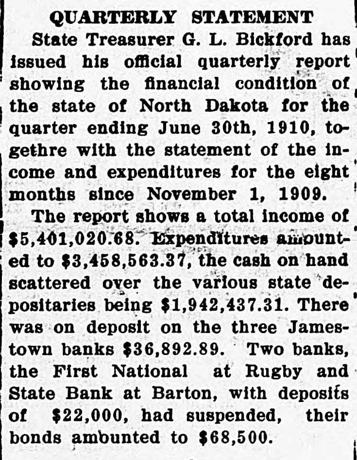 QUARTERLY STATEMENT State Treasurer G. L. Bickford has issued his official quarterly report showing the financial condition of the state of North Dakota for the quarter ending June 30th, 1910, togethre with the statement of the income and expenditures for the eight months since November 1, 1909. The report shows a total income of $5,401,020.68. Expenditures amounted to $3,458,563.37, the cash on hand scattered over the various state depositaries being $1,942,437.31. There was on deposit on the three Jamestown banks $36,892.89. Two banks, the First National at Rugby and State Bank at Barton, with deposits of $22,000, had suspended, their bonds ambunted to $68,500.