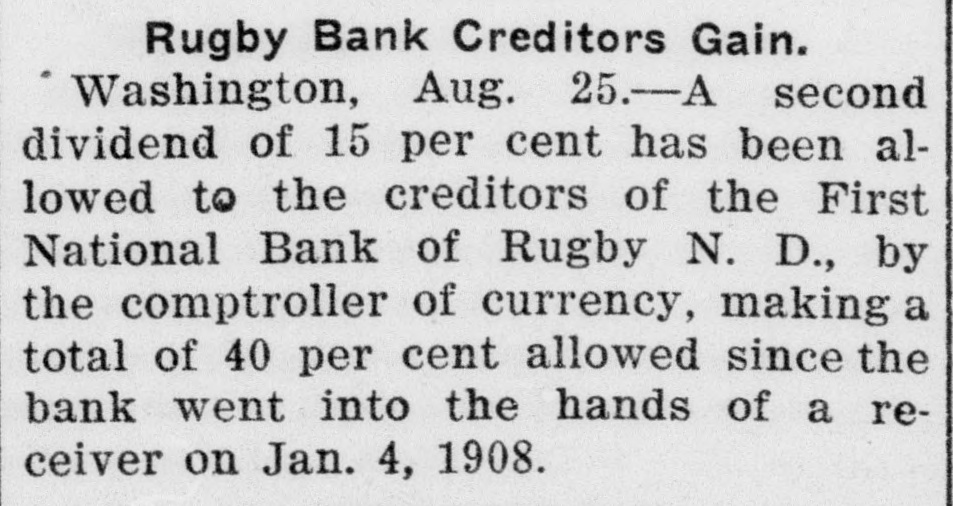 Rugby Bank Creditors Gain. Washington, Aug. 25.-A second dividend of 15 per cent has been allowed to the creditors of the First National Bank of Rugby N. D., by the comptroller of currency, making a total of 40 per cent allowed since the bank went into the hands of a receiver on Jan. 4, 1908.