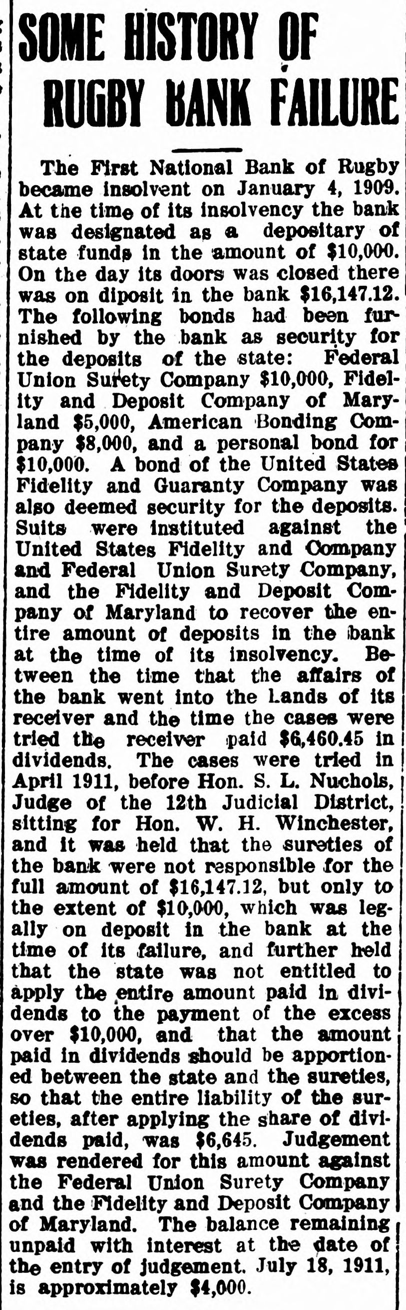 SOME HISTORY OF RUGBY BANK FAILURE The First National Bank of Rugby became insolvent on January 4, 1909. At the time of its insolvency the bank was designated as a depositary of state funds in the amount of $10,000. On the day its doors was closed there was on diposit in the bank $16,147.12. The following bonds had been furnished by the bank as security for the deposits of the state: Federal Union Surety Company $10,000, Fidelity and Deposit Company of Maryland $5,000, American Bonding Company $8,000, and a personal bond for $10,000. A bond of the United States Fidelity and Guaranty Company was also deemed security for the deposits. Suits were instituted against the United States Fidelity and Company and Federal Union Surety Company, and the Fidelity and Deposit Company of Maryland to recover the entire amount of deposits in the bank at the time of its insolvency. Between the time that the affairs of the bank went into the Lands of its receiver and the time the cases were tried the receiver paid $6,460.45 in dividends. The cases were tried in April 1911, before Hon. S. L. Nuchols, Judge of the 12th Judicial District, sitting for Hon. W. H. Winchester, and it was held that the sureties of the bank were not responsible for the full amount of $16,147.12, but only to the extent of $10,000, which was legally on deposit in the bank at the time of its failure, and further held that the state was not entitled to apply the entire amount paid in dividends to the payment of the excess over $10,000, and that the amount paid in dividends should be apportioned between the state and the sureties, so that the entire liability of the sureties, after applying the share of dividends paid, was $6,645. Judgement was rendered for this amount against the Federal Union Surety Company and the Fidelity and Deposit Company of Maryland. The balance remaining unpaid with interest at the date of the entry of judgement. July 18, 1911, is approximately $4,000.
