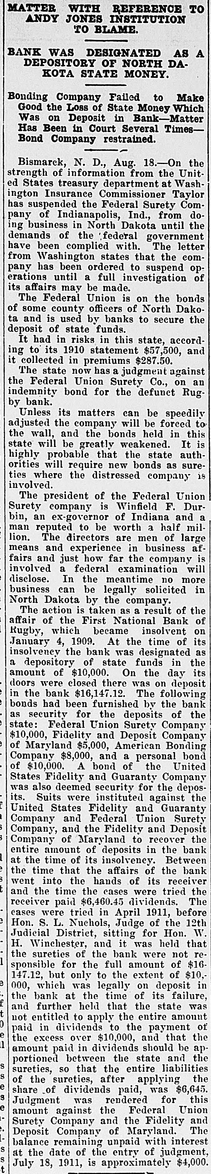 MATTER WITH REFERENCE TO ANDY JONES INSTITUTION TO BLAME. BANK WAS DESIGNATED AS A DEPOSITORY OF NORTH DAKOTA STATE MONEY. Bonding Company Failed to Make Good the Loss of State Money Which Was on Deposit in Bank-Matter Has Been in Court Several Times— Bond Company restrained. Bismarck, N. D., Aug. 18.-On the strength of information from the United States treasury department at Washington Insurance Commissioner Taylor has suspended the Federal Surety Company of Indianapolis, Ind., from doing business in North Dakota until the demands of the federal government have been complied with. The letter from Washington states that the company has been ordered to suspend operations until a full investigation of its affairs may be made. The Federal Union is on the bonds of some county officers of North Dakota and is used by banks to secure the deposit of state funds. It had in risks in this state, according to its 1910 statement $57,500, and it collected in premiums $287.50. The state now has a judgment against the Federal Union Surety Co., on an indemnity bond for the defunct Rugby bank. Unless its matters can be speedily adjusted the company will be forced to the wall, and the bonds held in this state will be greatly weakened. It is highly probable that the state authorities will require new bonds as sureties where the distressed company is involved. The president of the Federal Union Surety company is Winfield F. Durbin, an ex-governor of Indiana and a man reputed to be worth a half million. The directors are men of large means and experience in business affairs and just how far the company is involved a federal examination will disclose. In the meantime no more business can be legally solicited in North Dakota by the company. The action is taken as a result of the affair of the First National Bank of Rugby, which became insolvent on January 4, 1909. At the time of its insolvency the bank was designated as a depository of state funds in the amount of $10,000. On the day its doors were closed there was on deposit in the bank $16,147.12. The following bonds had been furnished by the bank as security for the deposits of the state: Federal Union Surety Company $10,000, Fidelity and Deposit Company of Maryland $5,000, American Bonding Company $8,000, and a personal bond of $10,000. A bond of the United States Fidelity and Guaranty Company was also deemed security for the deposits. Suits were instituted against the