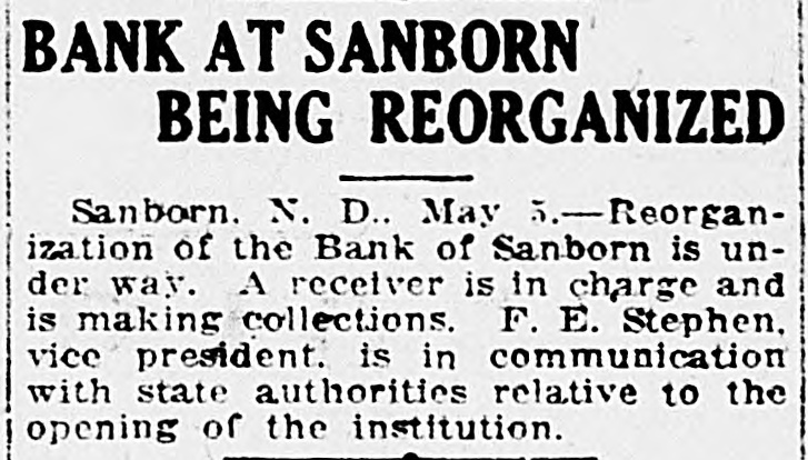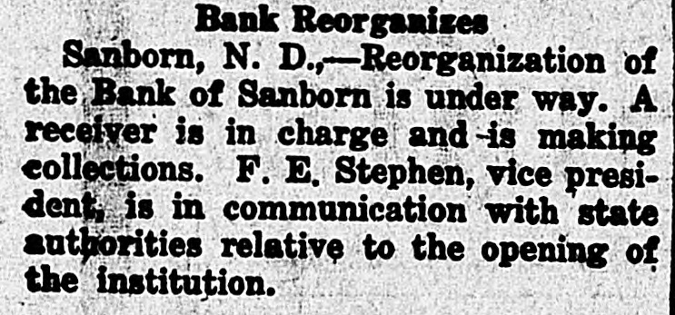 Bank Reorganizes Sanborn, N. D.,-Reorganization of the Bank of Sanborn is under way. A receiver is in charge and is making collections. F. E. Stephen, vice president, is in communication with state authorities relative to the opening of the institution.
