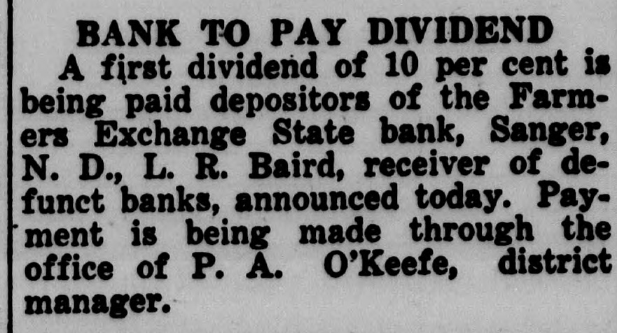 BANK TO PAY DIVIDEND A first dividend of 10 per cent is being paid depositors of the Farmers Exchange State bank, Sanger, N. D., L. R. Baird, receiver of defunct banks, announced today. Payment is being made through the office of P. A. O'Keefe, district manager.