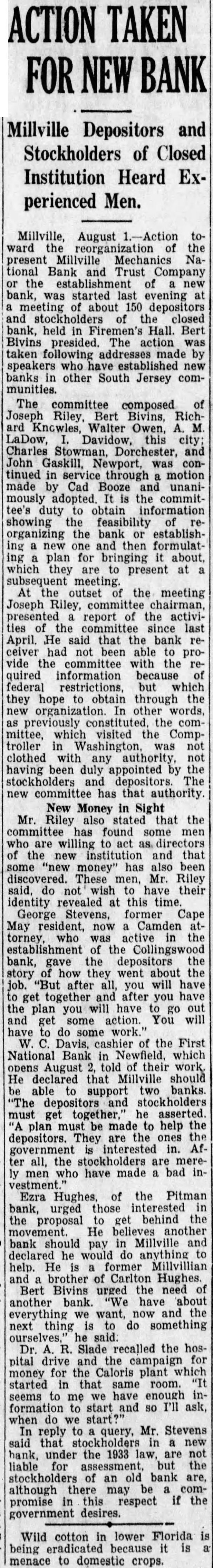 ACTION TAKEN FOR NEW BANK Millville Depositors and Stockholders of Closed Institution Heard Experienced Men. Millville, August Millville Mechanics tional Bank Trust the establishment bank, started last evening meeting about 150 depositors and stockholders the closed bank, held in Firemen's Hall. Bert Bivins presided. action taken speakers who banks other South Jersey communities. The committee composed Joseph Riley. Bert Bivins, RichKnowles, Walter Owen, LaDow, Davidow, this Charles Stowman, Dorchester, and John Gaskill, Newport, was continued through motion made Cad and unanithe committo obtain showing the feasibility organizing the or establishthen formulatplan for bringing about, which are present at meeting. the outset the meeting Joseph chairman, presented report the activities last April. He said that the bank receiver had been prothe committee the required information because federal restrictions, which they hope to obtain through previously the committee, which visited the Comptroller clothed with having been duly appointed stockholders depositors new committee has authority. Money in Sight Mr. stated that the found who and that some money" also discovered. These men, Mr. Riley have their identity revealed this time. George Stevens, former Cape resident, now Camden torney was active the bank, the depositors how went about 'But after will get together after you the plan have and get some action. You will some work." of the First National Bank which August their He declared that Millville should support banks "The stockholders must asserted. plan made help depositors. are the interested all, the men who have made bad investment. Ezra of the Pitman bank, interested the proposal behind the He another bank should Millville and he would anything He Millvillian brother Carlton Hughes. Bert Bivins urged the of another bank. about everything want, and the next thing to do something ourselves," Dr. recalled the hospital drive for money for the Caloris plant which started in that same room. enough inseems me formation to start and so I'll ask, when do we start?" In reply to query, Mr. Stevens under the 1933 law are liable the stockholders an old bank are, although there compromise in respect if the government desires. Wild cotton in lower Florida being because menace to domestic crops.