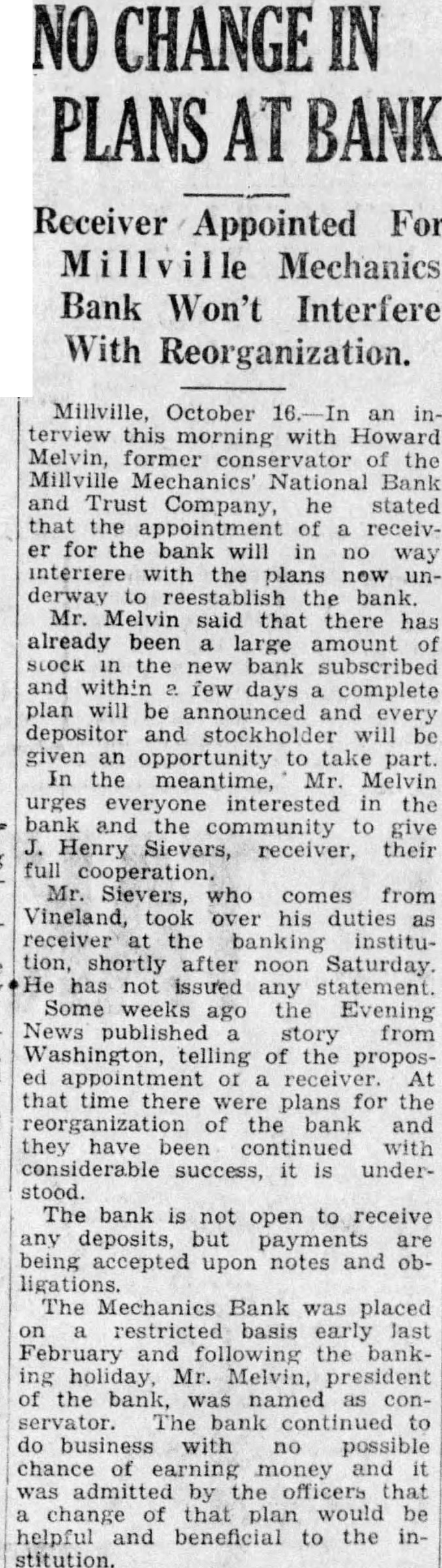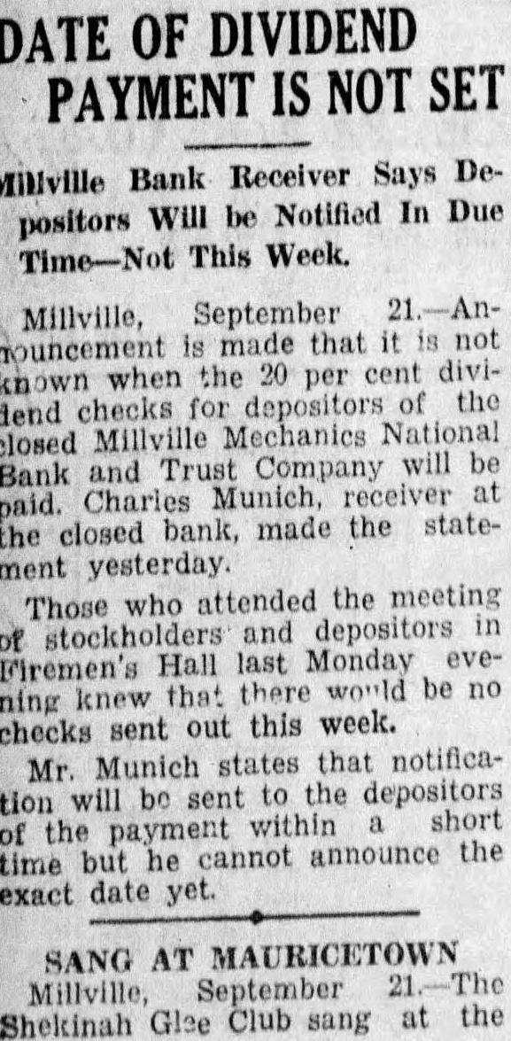 A special committee of stockholders In and depositors of the closed MechanMechanics ics National Bank and Trust Company will be held tonight, been learned today. The March committee was appointed to obtain special information and data regarding the collection, tions to date and the financial condition the bank which is now in the hands of receiver, Charles Munich. committee is made Charles The Stowman, Dorchester: John Gaskill, assets Newport; Walter Owen, Joseph Riley, Jr., and LaDow, of Miliville. ment was Owens and Stowman were members of another committee which was organized some time ago to attempt to organize another bank here. They have conferred with officials at Wash912.35. ington and the belief that city Under the size of Millville should have two shows banks. The appointment of this special committee was authorized in resolution submitted at recent meeting of the depositors and stockholders. Under the tentative plan, new bank would organized with capital stock of $125,000. Previous tempts have failed because local business men refused to assume the sposibility as directors of the new bank. the date Now, however. the project has been 1933: endorsed by several organizations throughout the city and it beleved the proposal can be successfully acment complished. Clarence Wolf. president of the Millville Board of Trade, signified the Rents support of that body in co-operative campaign to establish the new bank. Roy Oliver, president of the Owners wants Club, the proposal. Mayor Harry Van Hook stated that the City will do what possible in the plan. Stowman said that support the at- Accounted tempt the residents of he believes the proposal can cessfully accomplished.