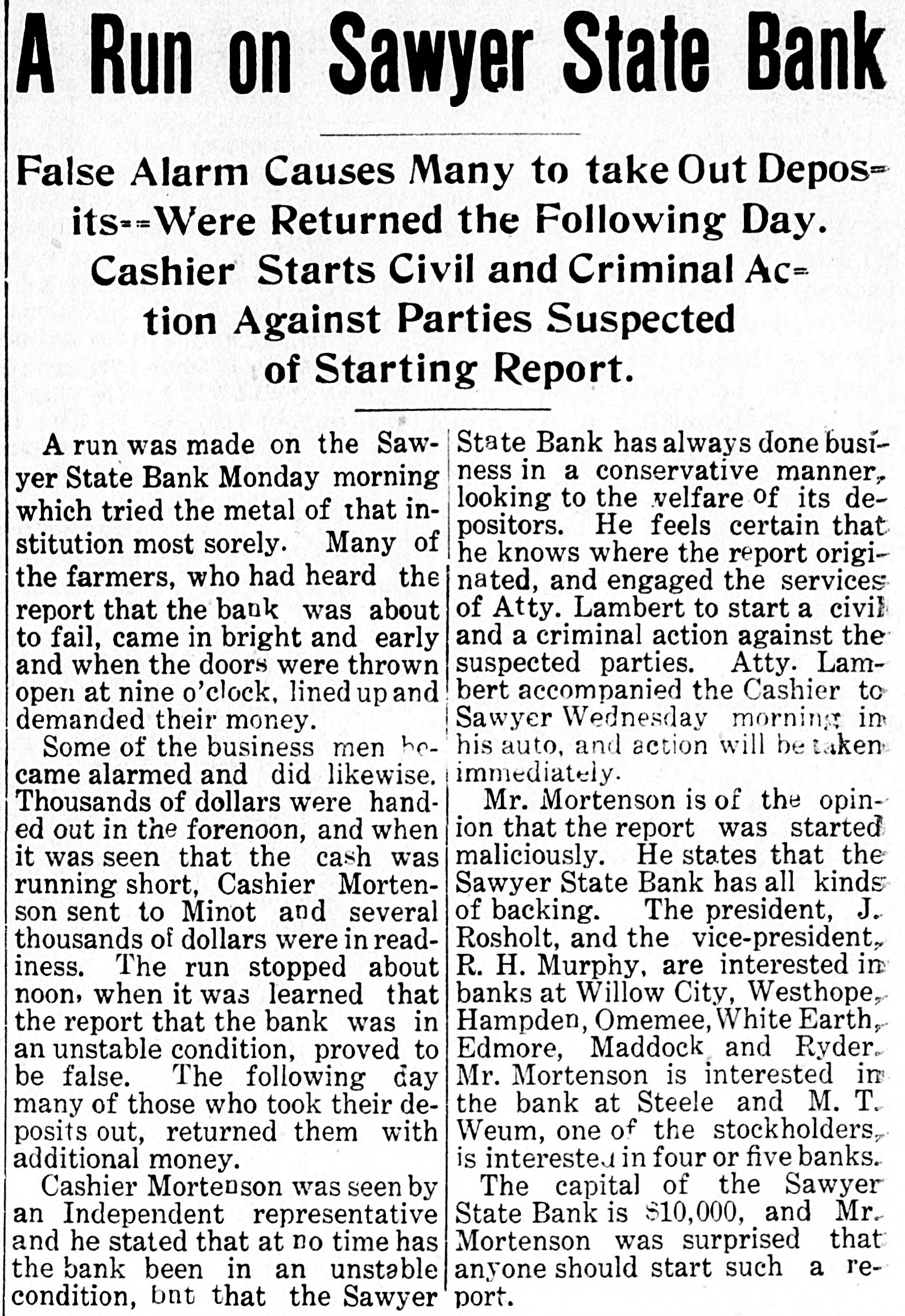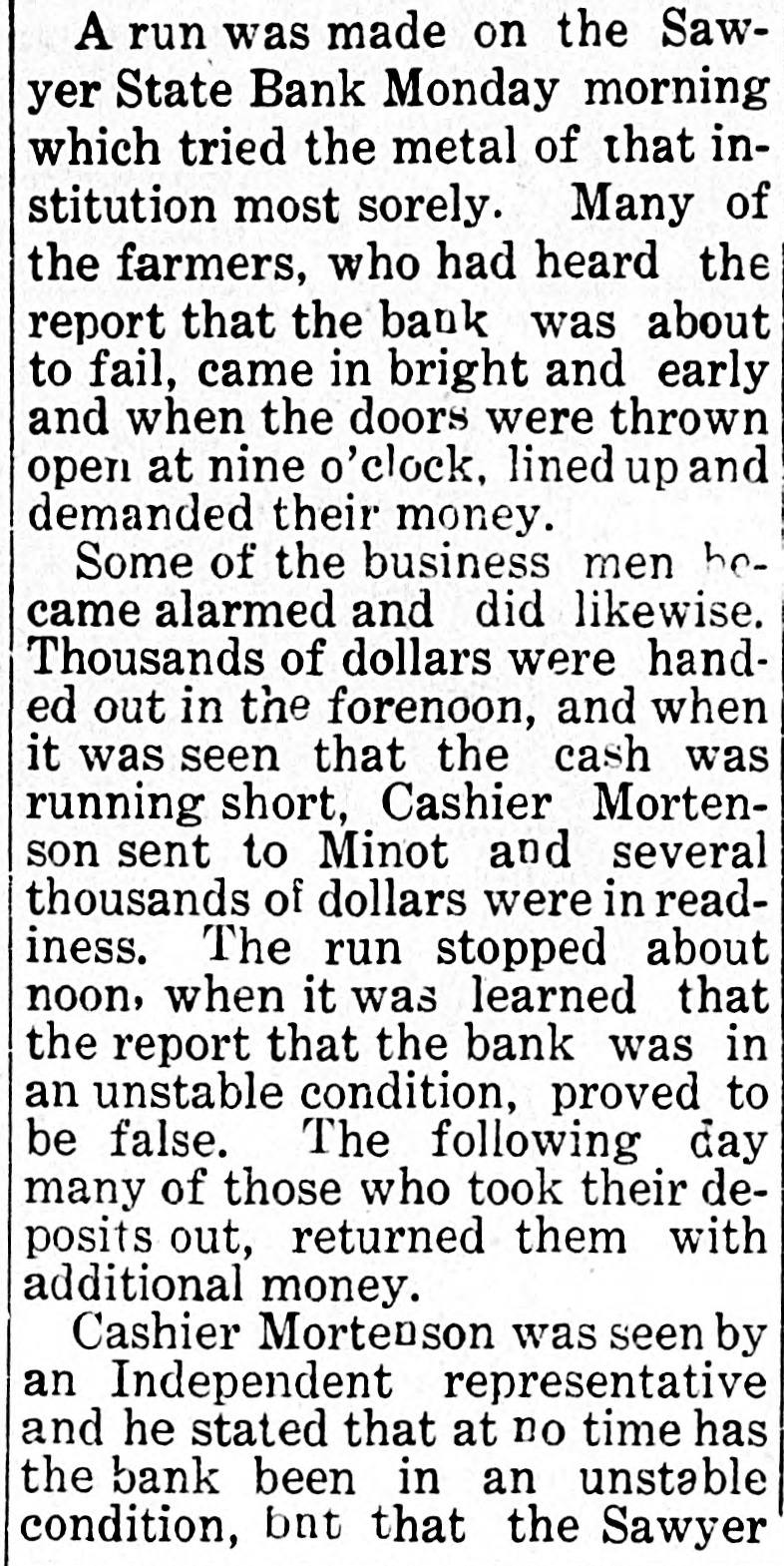 A Run on Sawyer State Bank False Alarm Causes Many to take Out Deposits==Were Returned the Following Day. Cashier Starts Civil and Criminal Ac= tion Against Parties Suspected of Starting Report. A run was made on the SawState Bank has always done business in a conservative manner. yer State Bank Monday morning looking to the welfare of its dewhich tried the metal of that inpositors. He feels certain that stitution most sorely. Many of he knows where the report origithe farmers, who had heard the nated, and engaged the services of Atty. Lambert to start a civil report that the bank was about and a criminal action against the to fail, came in bright and early and when the doors were thrown suspected parties. Atty. Lambert accompanied the Cashier to open at nine o'clock, lined up and Sawyer Wednesday morning in demanded their money. his auto, and action will betaken Some of the business men hecame alarmed and did likewise. immediately. Thousands of dollars were handMr. Mortenson is of the opinion that the report was started ed out in the forenoon, and when it was seen that the cash was maliciously. He states that the Sawyer State Bank has all kinds running short, Cashier Mortenson sent to Minot and several of backing. The president, J. thousands of dollars were in readRosholt, and the vice-president, R. H. Murphy, are interested in iness. The run stopped about noon, when it was learned that banks at Willow City, Westhope, Hampden, Omemee, White Earth, the report that the bank was in Edmore, Maddock and Ryder. an unstable condition, proved to Mr. Mortenson is interested in be false. The following day the bank at Steele and M. T. many of those who took their deWeum, one of the stockholders, posits out, returned them with is interested in four or five banks. additional money. The capital of the Sawyer Cashier Mortenson was seen by State Bank is $10,000, and Mr. an Independent representative and he stated that at no time has Mortenson was surprised that the bank been in an unstable anyone should start such a recondition, bnt that the Sawyer port.