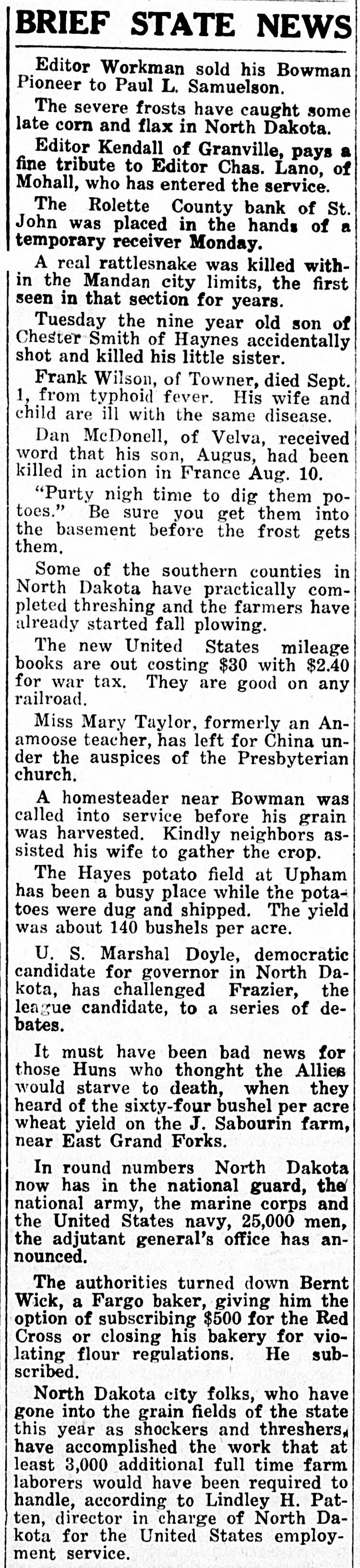 STATE BANKS SHOW INCREASE During the Year Resources Have Increased Over $7,000,000. Bismarck, N. D., Aug. 17.-The state examiner's department has just issued an abstract, of comparative statement of the financial condition of state banks and trust companies in North Dakota reporting for calls at the close of business on June 20, 1917, and May 10, 1918, with the call of June 29, 1918. The figures for the call for report of condition of banks and trust companies as of June 29, 1918, just compiled, show that the resources of the state banks of North Dakota have maintained their usual steady forward growth despite the withdrawing strain on reserves by reason of the concurrence in government issues of Liberty Loans, War Savings Stamps, Thrift stamps, certificates of indebtedness, Red Cross, etc., and the tax paying period at the end of the fiscal year. During the past year the resources have made a steady growth of $7,073,378.50. The financial condition of North 19 Dakota state banks is the best in the history of the state. On account of the very careful and rigid business supervision and the careful and thorough investigation of each individual bank by the state depositors' guaranty fund commission preliminary to issuing certificates of admittance under this guaranty for bank deposits, each bank admitted has undergone a thorough scrutiny and has been forced to make a complete financial and business house-cleaning of all undesirable assets, business deals and practices. This action has placed the banks in better condition than 'they have been in their history. This will be thoroughly understood when you learn that over $2,000,0001 of assets which\ were considered undesirable and questionable by the depositors' guaranty fund commission, was ordered charged out of the banks. This has been a heavy strain on the assets and profits of the banks in a new and growing state like North Dakota. The banks now fully understand the wisdom of the men who are supervising the work under this act, and the great value of the act itself to the depositor, the banks and the state, and are helping to put their whole united force for the forward drive for its success. On account of the work of the commission, the Rolette county bank at St. John and the Security bank at Knox, N. D., had to be closed and their affairs will be liquidated. In a grain growing state like North Dakota, deposits show a decline at this time of the year, but in spite of this expectation and the unsettled business condition, the examiner's report shows an increase over the call of June 20. 1917, of $3,000,000. The total cash reserve at the low period has maintained its usual high level and has fluctuated very little. Bills payable have increased $2,000.000 over the last call but we find that the larger portion of this is high class securities discounted with the Federal Reserve bank.