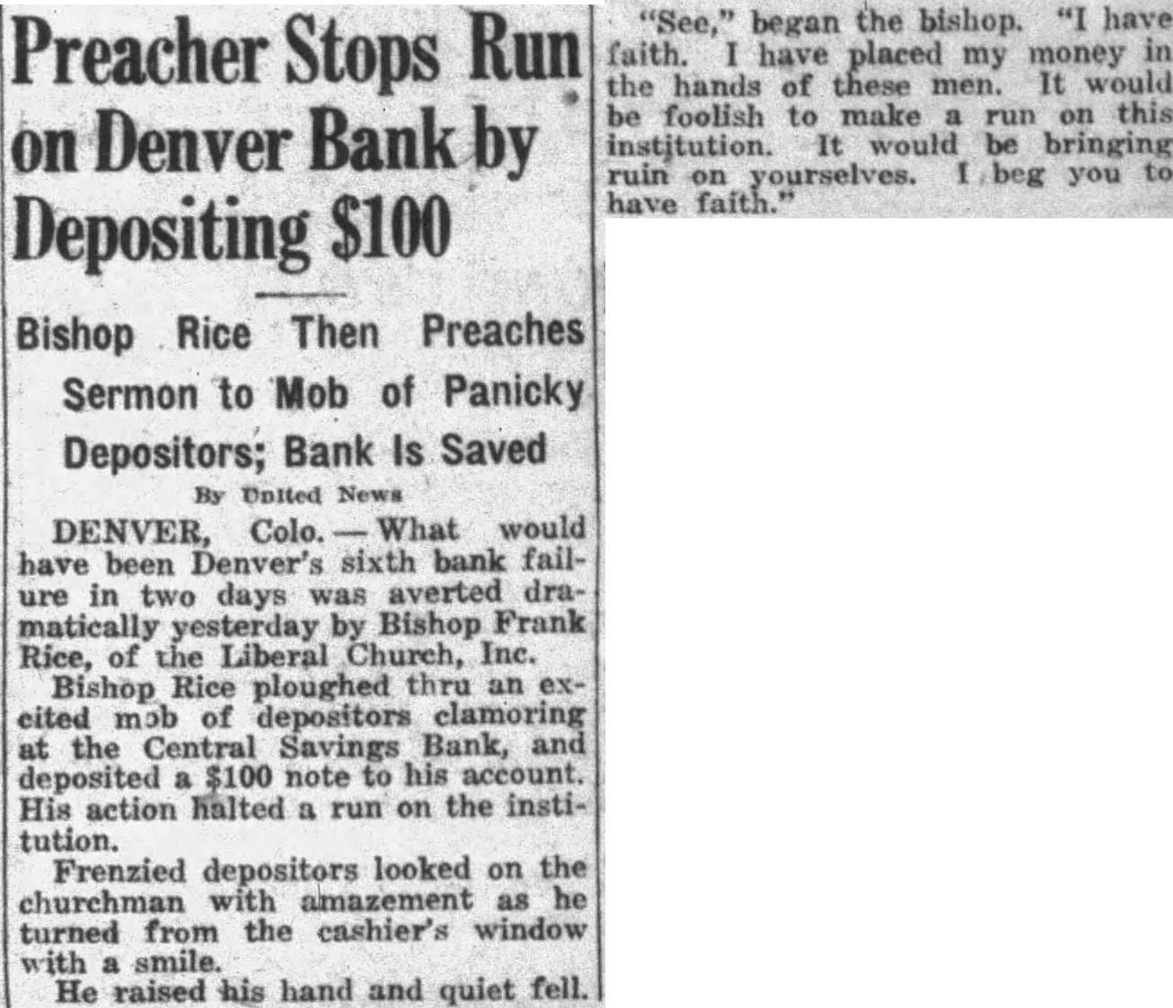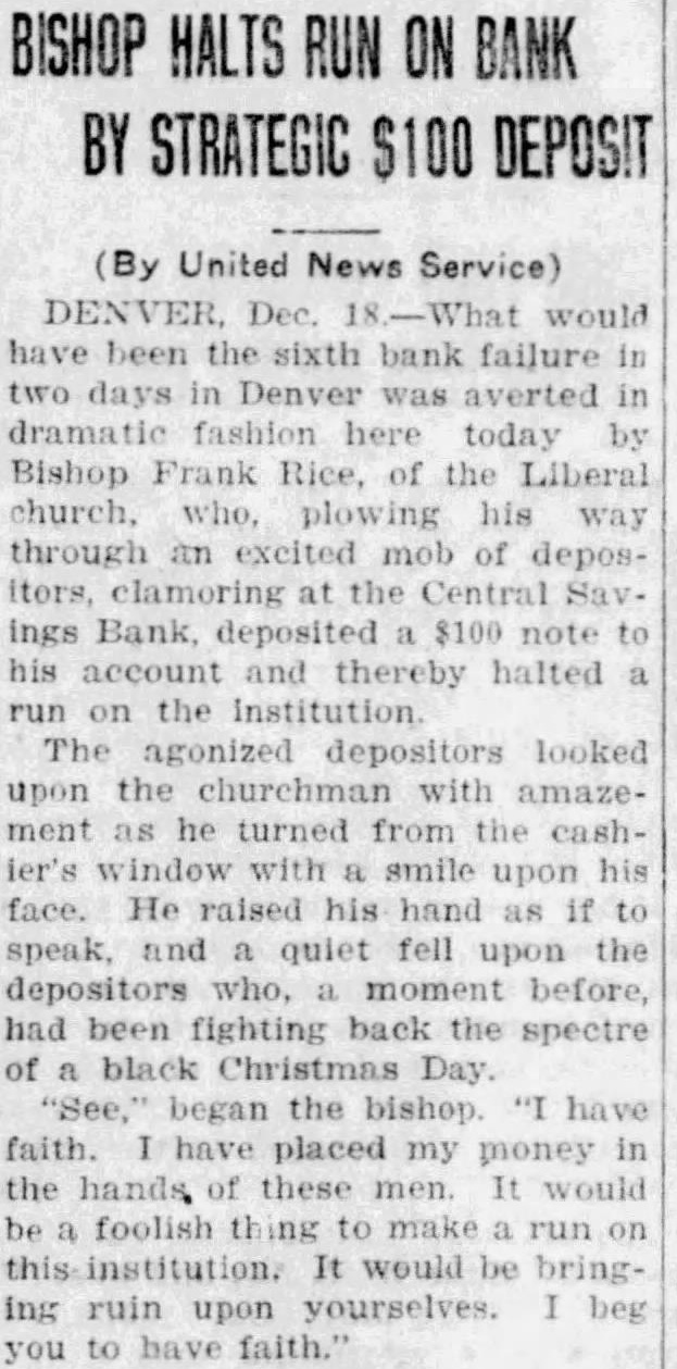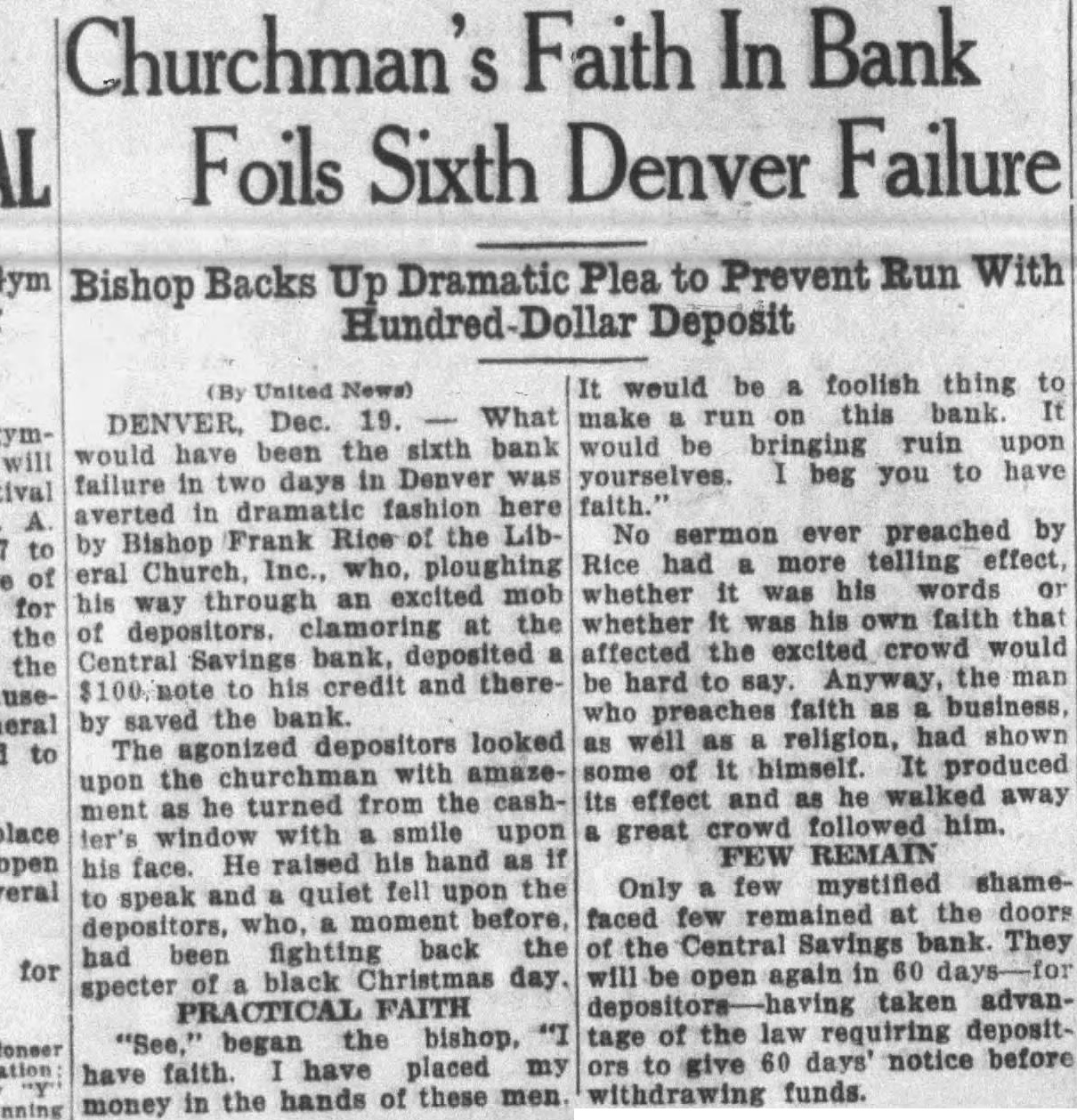DENVER, Colo. What would have been Denver's sixth bank failure in two days was averted dramatically yesterday by Bishop Frank Rice, of the Liberal Church, Inc. Bishop Rice ploughed thru an excited mob of depositors clamoring at the Central Savings Bank, and deposited a $100 note to his account. His action halted a run on the institution. Frenzied depositors looked on the churchman with amazement as he turned from the cashier's window with a smile. He raised his hand and quiet fell.