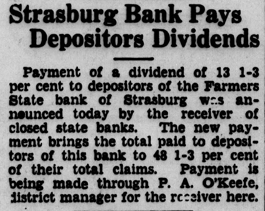 Strasburg Bank Pays Depositors Dividends Payment of a dividend of 13 1-3 per cent to depositors of the Farmers State bank of Strasburg was announced today by the receiver of closed state banks. The new payment brings the total paid to depositors of this bank to 48 1-3 per cent of their total claims. Payment is being made through P. A. O'Keefe, district manager for the roceiver here.