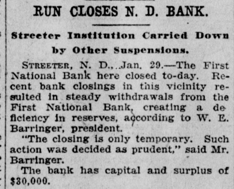 RUN CLOSES N. D. BANK. Streeter Institution Carried Down by Other Suspensions. STREETER, N. D.,..Jan. 29.-The First National Bank here closed to-day. Recent bank closings in this vicinity resulted in steady withdrawals from the First National Bank, creating a de ficiency in reserves, according to W. E. Barringer, president. "The closing is only temporary. Such action was decided as prudent," said Mr. Barringer. The bank has capital and surplus of $30,000.