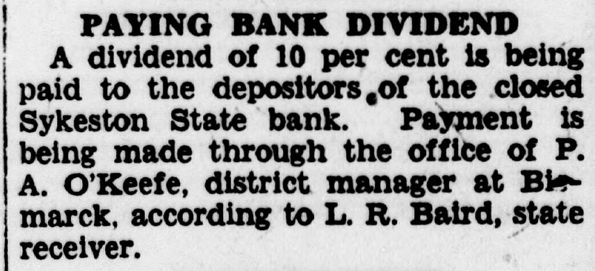 PAYING BANK DIVIDEND A dividend of 10 per cent is being paid to the depositors of the closed Sykeston State bank. Payment is being made through the office of P. A. O'Keefe, district manager at Biemarck, according to L. R. Baird, state receiver.