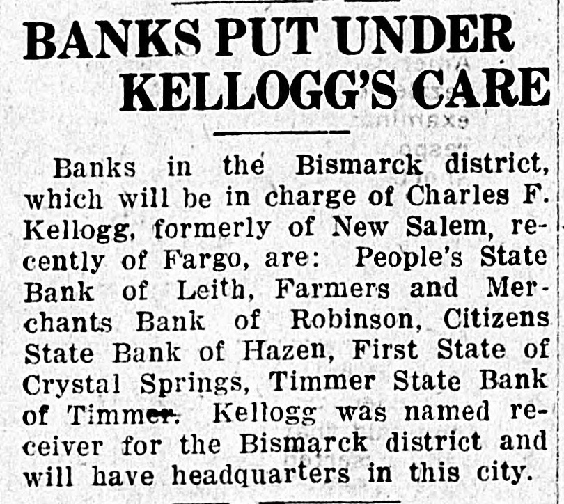 BANKS PUT UNDER KELLOGG'S CARE agast Banks in the Bismarck district, which will be in charge of Charles F. Kellogg, formerly of New Salem, recently of Fargo, are: People's State Bank of Leith, Farmers and Merchants Bank of Robinson, Citizens State Bank of Hazen, First State of Crystal Springs, Timmer State Bank of Timmer. Kellogg was named receiver for the Bismarck district and will have headquarters in this city.
