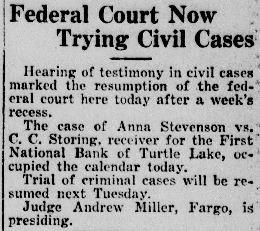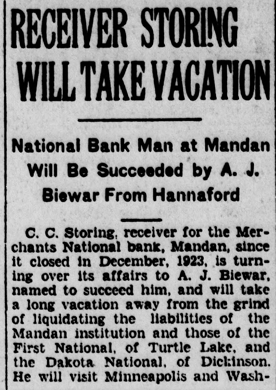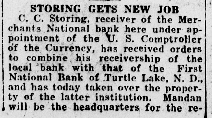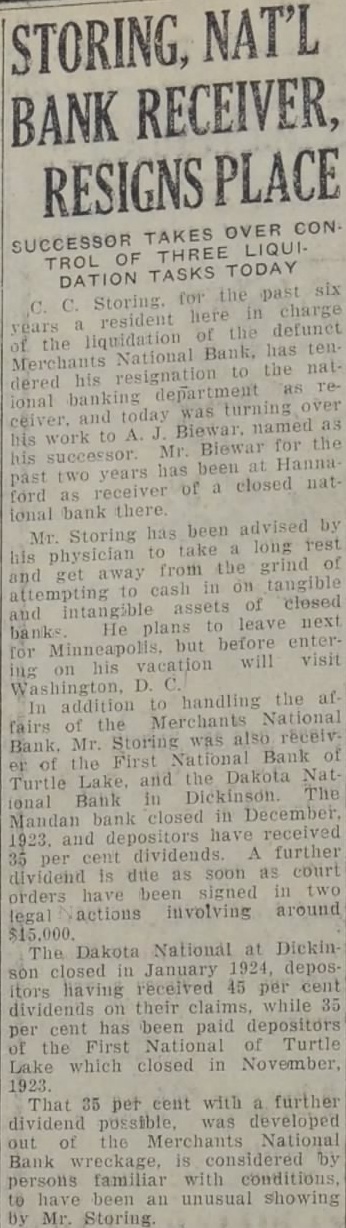 to maintain homes in Mandan. And these 47 could not be counted as Mandan citizens because their homes are not in the city. "In addition there are several score more men, most of the traveling salesmen, who would establish their headquarters and homes here if proper apartment houses or housing facilities were available." It is very probable, Mr. Iverson said, that some persons were overlooked in the census taking. Some persons dodged the census taker because they sought to evade assessments, it was indicated, although this type was scarce, and others may have been skipped accidentally, although every house in the city was canvassed and data secured. Some interesting information was obtained by the assessor. Of the 5,068 listed, just an even 100 are foreign Dorn who have not yet acquired U. S. citizenship. The city has 2,570 males and 2,498 females. Five negroes are residents here, three males and two females. Of the 624 citizens who were born in foreign countries, 524 have been naturalized. There are 331 males and 292 females in this class. Just 252 boys and 284 girls of the city are under 5 years of age, while there are 178 men and -126 women who are over 60 years old. There are 822 boys between 5 and 20 years old and 871 girls of the same age; 1,281 men and 1,180 women are between 20 and 60 years of age. Referring to the housing problem, Mr. Iverson learned that there are 1,125 families in the city living in 1,025 dwellings. The books on the census will not close until July 1, Mr. Iverson says, and he urges persons who think they may have been missed in the enumeration to phone him at his home or his office, 28W. FARMER DIES Joseph Soucy, aged 74, one of the most prosperous and best known farmers of this district, died at 4:30 o'clock Sunday afternoon at his home 14 miles southwest of the city. His health failed about six months ago due to his advanced age and he gradually weakened until death ended his sufferings Sunday. Mr. Soucy came to Morton county with his family in 1906, taking a homestead 14 miles south of the city. He was one of the first men to ever successfully establish a fruit orchard in the county and his diversification in farming methods netted him a comfortable living and competence. He was born August 2, 1851, in eastern Canada and as a young man moved to the western provinces and farmed. Coming to the United States for a time he was married at St. Paul in 1882 to Miss Juliana Resch and later returned to Canada. His widow and two sons and four daughters survive. He was a member of St. Joseph Catholic church of Mandan and the funeral services will be held from that church at 10 o'clock Wednesday morning with Rev. Fr. Clement Dimpfl conducting the requiem mass. Burial will be in the union cemetery. STORING GETS NEW JOB C. C. Storing. receiver of the Merchants National bank here under appointment of the U. S. Comptroller of the Currency, has received orders to combine his receivership of the local bank with that of the First National Bank of Turtle Lake, N. D., and has today