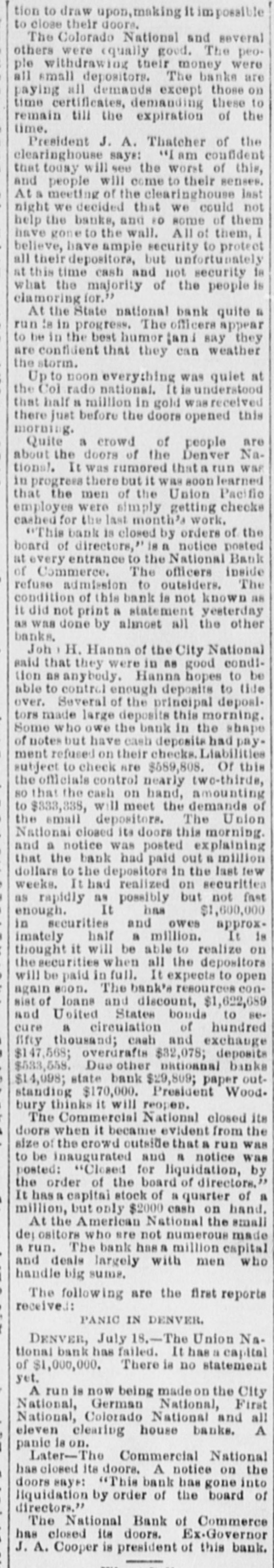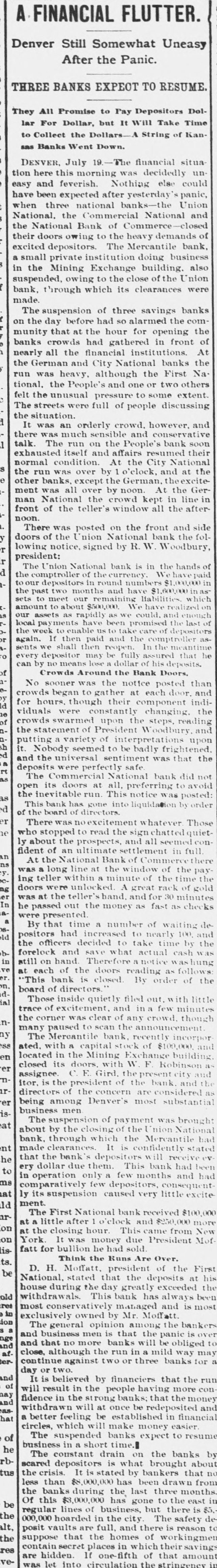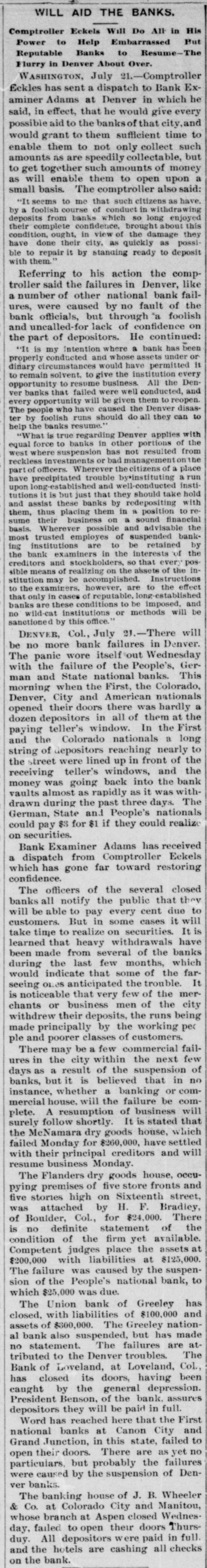 WILL AID THE BANKS. Comptroller Eckels Will Do All in His Power to Help Embarrassed But Reputable Banks to Resume-The Flurry in Denver About Over. WASHINGTON, July 21.-Comptroller Eckles has sent a dispatch to Bank Examiner Adams at Denver in which he said, in effect, that he would give every possible aid to the banks of that city, and would grant to them sufficient time to enable them to not only collect such amounts as are speedily collectable, but to get together such amounts of money as will enable them to open upon a small basis. The comptroller also said: "It seems to me that such citizens as have. by a foolish course of conduct in withdrawing deposits from banks which so long enjoyed their complete confidence, brought about this condition, ought, in view of the damage they have done their city, as quickly as possible to repair it by standing ready to deposit with them.' Referring to his action the comptroller said the failures in Denver, like a number of other national bank failures, were caused by no fault of the bank officials, but through a foolish and uncalled-for lack of confidence on the part of depositors. He continued: "It is my Intention where a bank has been properly conducted and whose assets under or dinary circumstances would have permitted it to remain solvent, to give the institution every opportunity to resume business. All the Denver banks that failed were well conducted, and every opportunity will be given them to reopen. The people who have caused the Denver disaster by foolish runs should do all they can to help the banks resume." "What is true regarding Denver applies with equal force to banks in other portions of the west where suspension has not resulted from reckless investments or bad managemento the part of officers. Wherever the citizens of a place have precipitated trouble by*instituting a run upon long-established and well-conducted institutions it is but just that they should take hold and assist these banks by redepositing with them, thus placing them in A position to resume their business on a sound financial basis. Wherever possible and advisable the most trusted employes of suspended banking institutions are to be retained by the bank examiners in the interests of the creditors and stockholders, so that every possible means of realizing on the absets of the institution may be accomplished. Instructions to the examiners. however, are to the effect that only in cases of reputable, -established banks are these conditions to be imposed, and no wild-cat institutions or methods will be sanctioned by this office." DENVER, Col., July 21.-There will be no more bank failures in Denver. The panie wore itself out Wednesday with the failure of the People's, German and State national banks. This morning when the First, the Colorado, Denver, City and American nationals opened their doors there was hardly a dozen depositors in all of them at the paying teller's window. In the First and the Colorado nationals a long string of depositors reaching nearly to the street were lined up in front of the receiving teller's windows, and the money was going back into the bank vaults almost as rapidly as it was withdrawn during the past three days. The German, State and People's nationals could pay $3 for $1 if they could realize on securities. Bank Examiner Adams has received a dispatch from Comptroller Eckels which has gone far toward restoring confidence. The officers of the several closed banks all notify the public that they will be able to pay every cent due to customers. But in some cases it will take time to realize on securities. It is learned that heavy withdrawals have been made from several of the banks during the last few months, which would indicate that some of the farseeing anticipated the trouble. It is noticeable that very few of the merchants or business men of the city withdrew their deposits, the runs being made principally by the working pec ple and poorer classes of customers. There may be a few commercial failures in the city within the next few days as a result of the suspension of banks, but it is believed that in no instance, whether a banking or commercial house, will the failure be complete. A resumption of business will surely follow shortly. It is stated that the McNamara dry goods house, which failed Monday for $260,000, have settled with their principal creditors and will resume business Monday. The Flanders dry goods house, occupying premises of five store fronts and five stories high on Sixteenth street, was attached by H. F. Bradley, of Boulder, Col., for $24,000. There is no definite statement of the condition of the firm yet available. Competent judges place the assets at $200,000 with liabilities at $125,000. The failure was caused by the suspension of the People's national bank, to which $25,000 was due. The Union bank of Greeley has closed, with liabilities of $100,000 and assets of $300,000. The Greeley national bank also suspended, but has made no statement. The failures are attributed to the Denver troubles. The Bank of Loveland, at Loveland, Col., has closed its doors, having been caught by the general depression. President Benson, of the bank, assures depositors they will be paid in full. Word has reached here that the First national banks at Canon City and Grand Junction, in this state, failed to open their doors. There are as yet no particulars, but probably the failures were caused by the suspension of Denver banks. The banking house of J. B. Wheeler City and Manitou