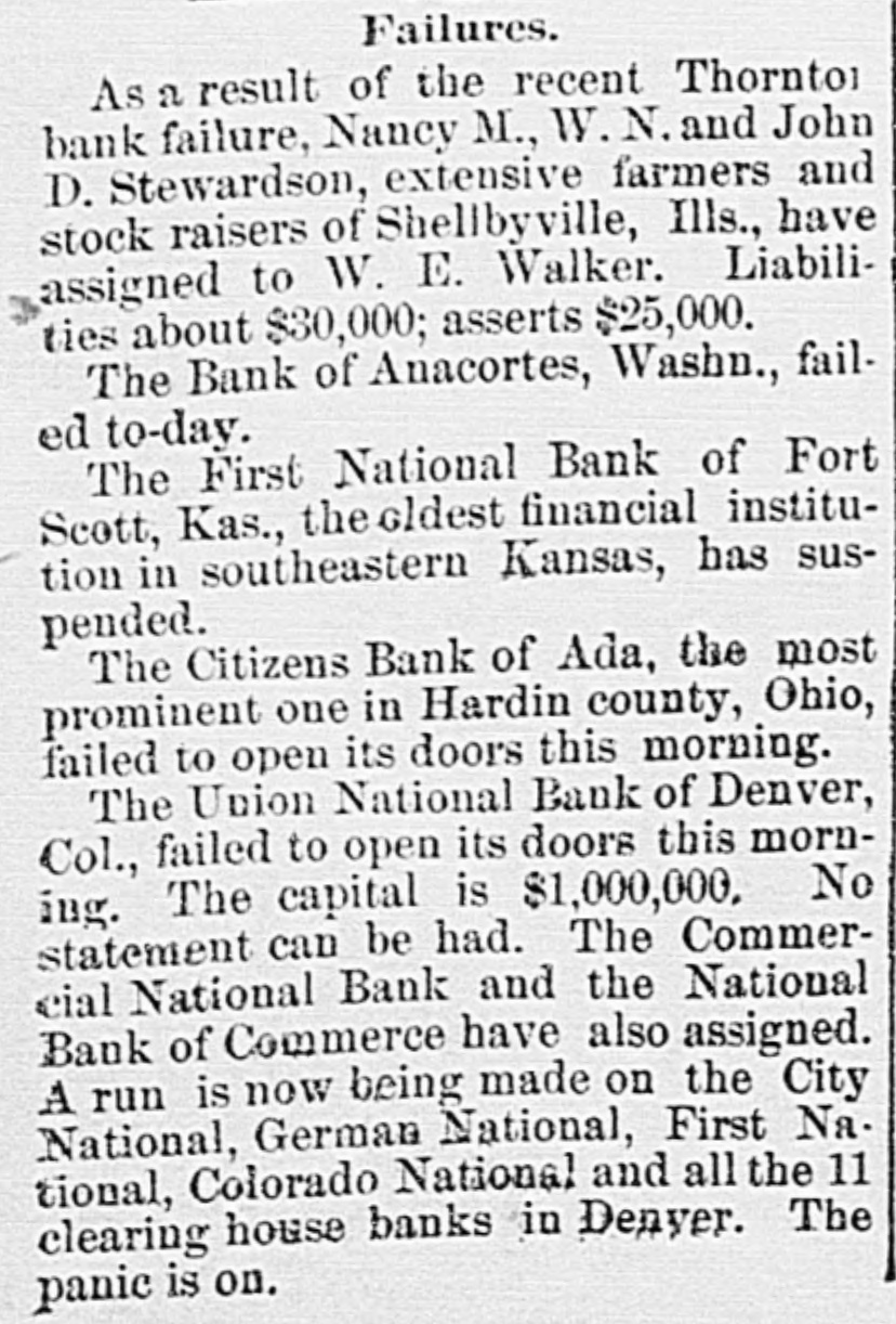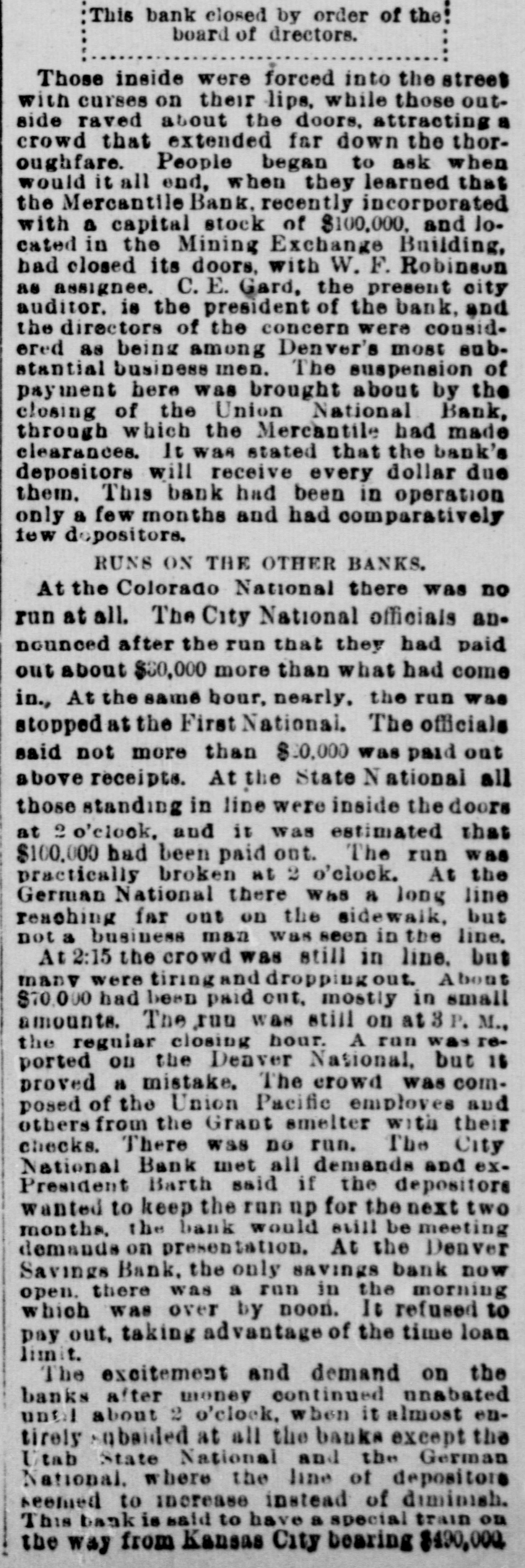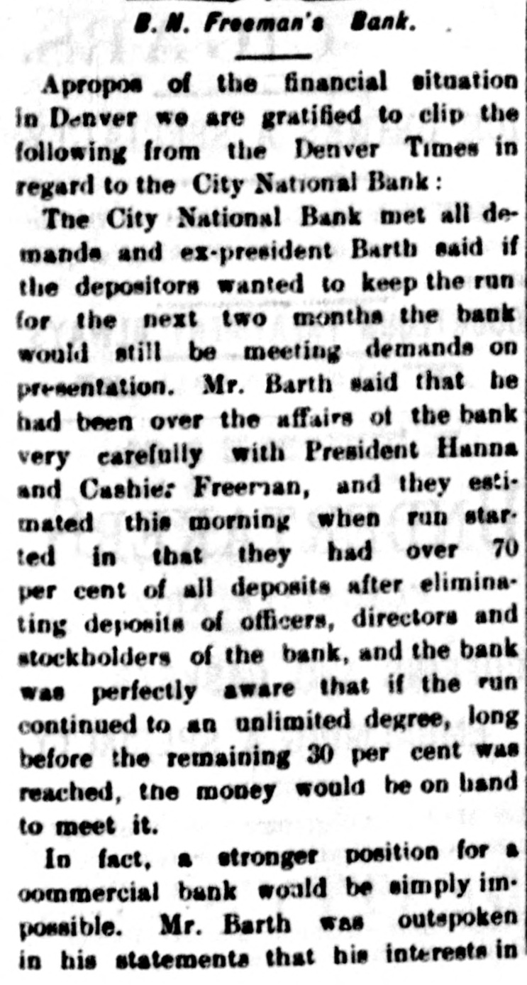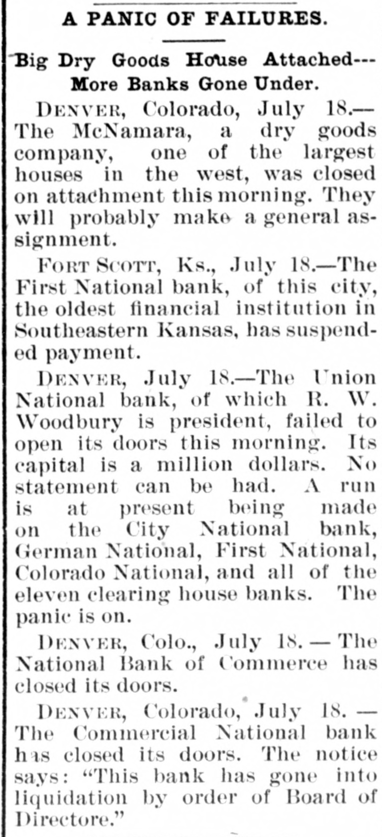 WILL AID THE BANKS. Comptroller Eckels Will Do All in His Power to Help Embarrassed But Reputable Banks to Resume-The Flurry in Denver About Over. WASHINGTON, July 21.-Comptroller Eckles has sent a dispatch to Bank Examiner Adams at Denver in which he said, in effect, that he would give every possible aid to the banks of that city, and would grant to them sufficient time to enable them to not only collect such amounts as are speedily collectable, but to get together such amounts of money as will enable them to open upon a small basis. The comptroller also said: "It seems to me that such citizens as have. by a foolish course of conduct in withdrawing deposits from banks which so long enjoyed their complete confidence, brought about this condition, ought, in view of the damage they have done their city, as quickly as possible to repair it by standing ready to deposit with them.' Referring to his action the comptroller said the failures in Denver, like a number of other national bank failures, were caused by no fault of the bank officials, but through a foolish and uncalled-for lack of confidence on the part of depositors. He continued: "It is my Intention where a bank has been properly conducted and whose assets under or dinary circumstances would have permitted it to remain solvent, to give the institution every opportunity to resume business. All the Denver banks that failed were well conducted, and every opportunity will be given them to reopen. The people who have caused the Denver disaster by foolish runs should do all they can to help the banks resume." "What is true regarding Denver applies with equal force to banks in other portions of the west where suspension has not resulted from reckless investments or bad managemento the part of officers. Wherever the citizens of a place have precipitated trouble by*instituting a run upon long-established and well-conducted institutions it is but just that they should take hold and assist these banks by redepositing with them, thus placing them in A position to resume their business on a sound financial basis. Wherever possible and advisable the most trusted employes of suspended banking institutions are to be retained by the bank examiners in the interests of the creditors and stockholders, so that every possible means of realizing on the absets of the institution may be accomplished. Instructions to the examiners. however, are to the effect that only in cases of reputable, -established banks are these conditions to be imposed, and no wild-cat institutions or methods will be sanctioned by this office." DENVER, Col., July 21.-There will be no more bank failures in Denver. The panie wore itself out Wednesday with the failure of the People's, German and State national banks. This morning when the First, the Colorado, Denver, City and American nationals opened their doors there was hardly a dozen depositors in all of them at the paying teller's window. In the First and the Colorado nationals a long string of depositors reaching nearly to the street were lined up in front of the receiving teller's windows, and the money was going back into the bank vaults almost as rapidly as it was withdrawn during the past three days. The German, State and People's nationals could pay $3 for $1 if they could realize on securities. Bank Examiner Adams has received a dispatch from Comptroller Eckels which has gone far toward restoring confidence. The officers of the several closed banks all notify the public that they will be able to pay every cent due to customers. But in some cases it will take time to realize on securities. It is learned that heavy withdrawals have been made from several of the banks during the last few months, which would indicate that some of the farseeing anticipated the trouble. It is noticeable that very few of the merchants or business men of the city withdrew their deposits, the runs being made principally by the working pec ple and poorer classes of customers. There may be a few commercial failures in the city within the next few days as a result of the suspension of banks, but it is believed that in no instance, whether a banking or commercial house, will the failure be complete. A resumption of business will surely follow shortly. It is stated that the McNamara dry goods house, which failed Monday for $260,000, have settled with their principal creditors and will resume business Monday. The Flanders dry goods house, occupying premises of five store fronts and five stories high on Sixteenth street, was attached by H. F. Bradley, of Boulder, Col., for $24,000. There is no definite statement of the condition of the firm yet available. Competent judges place the assets at $200,000 with liabilities at $125,000. The failure was caused by the suspension of the People's national bank, to which $25,000 was due. The Union bank of Greeley has closed, with liabilities of $100,000 and assets of $300,000. The Greeley national bank also suspended, but has made no statement. The failures are attributed to the Denver troubles. The Bank of Loveland, at Loveland, Col., has closed its doors, having been caught by the general depression. President Benson, of the bank, assures depositors they will be paid in full. Word has reached here that the First national banks at Canon City and Grand Junction, in this state, failed to open their doors. There are as yet no particulars, but probably the failures were caused by the suspension of Denver banks. The banking house of J. B. Wheeler City and Manitou
