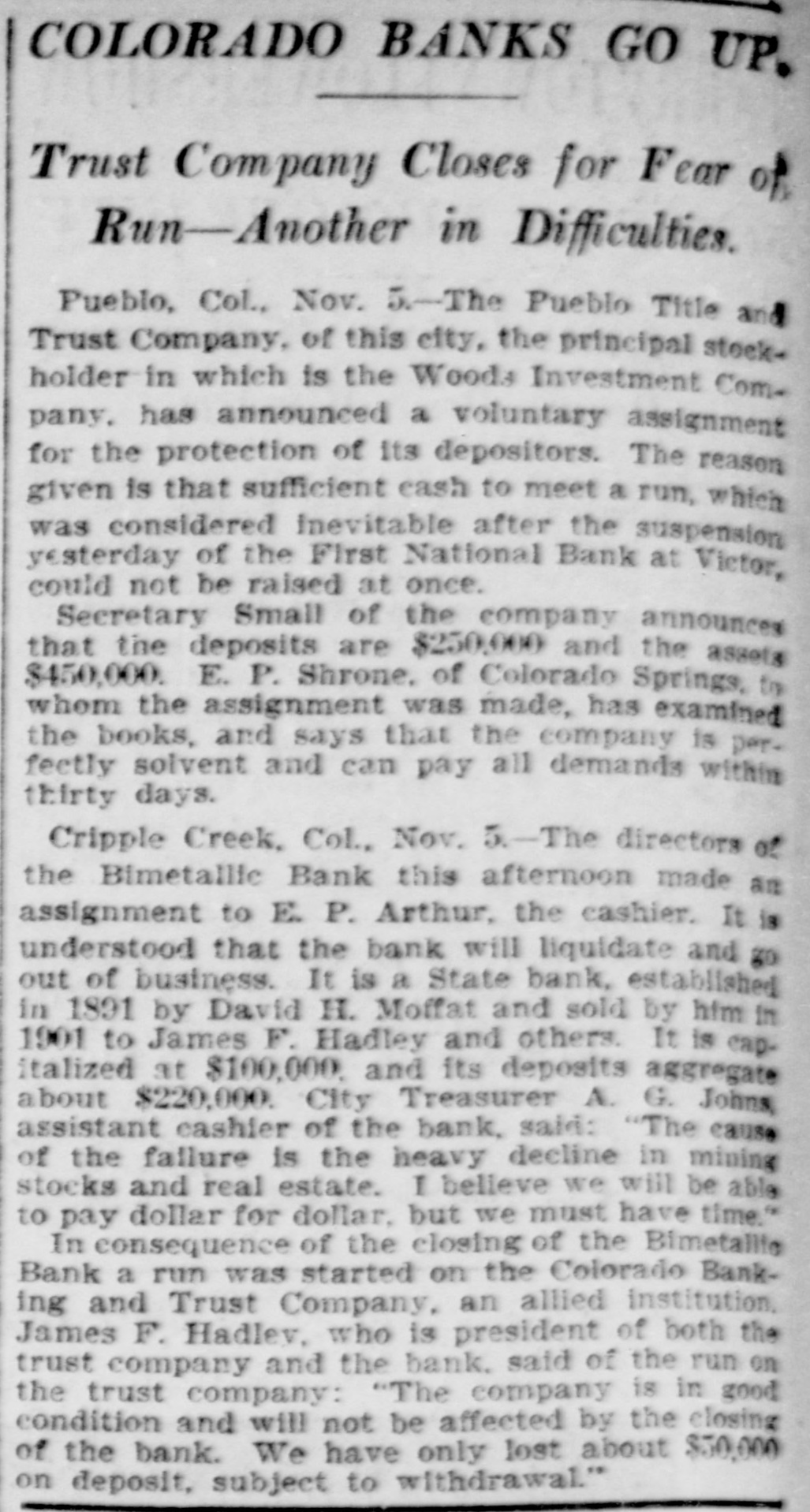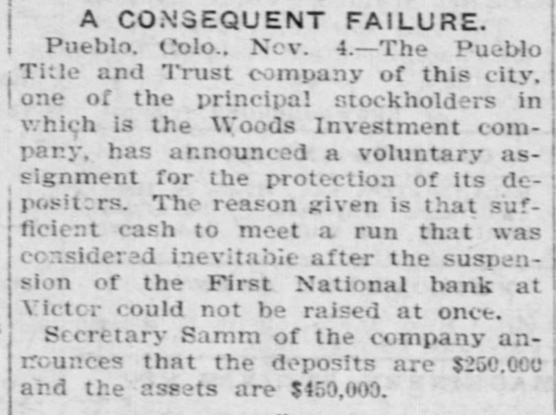 BANKS FAIL. A Trust Company Follows at Pueblo, Col. First National of Victor Closes Its Doors. Bi-Metallic at Cripple Creek Joins the Procession. DUE TO MINERS STRIKE Bank Officiais Were Interested in the Mines. Institution at Sheldon, Iowa, in Hands of Receiver. Colorado Springs, Col., Nov. 5.-A special to the Gazette from Victor states that the First National bank of Victor has closed its doors by order of Bank Examiner Lazear. Shrinkage of deposits as a result of the long continued miners' strike is given as the reason for suspending business. President F. M. Woods states that all depositors will be paid in full. The closing of the bank caused no apprehension in financial circles, either in Cripple Creek or Colorado Springs. TRUST COMPANY QUITS. Pueblo, Col., Nov. 5.-As a consequence of the failure of the First National bank of Victor, Col., the Pueblo Title and Trust company, capital $250,000, will not open for business today. The trust company is controlled by. the Woods Investment company which also owned the Victor institution. Small of the company anthat the deposits are nounce Secretary $250,000 and the assets are $450,000. An assignment has been made by the Pueblo Title and Trust company to E. P. Shove, of Colorado Springs. The bank did not open today, the managers being in fear of a run. Mr. Shove, after examining the condition of the assets stated today that the Title and Trust company is perfectly solvent and can pay all demands within 30 days. The bank's deposits are about a $250,000 including the accounts of aslarge number of working men. The sets are stated to be about $450,000. WOODS MAKES STATEMENT. Victor, Colo., Nov. 5.-Frank M. Woods, general manager of the Woods folInvestment company, has made the the lowing statement of the closing of of Victor National bank of this city, which "The he strike is president: resulted in withdrawals from the bank, chiefly by men who were leaving the district, and our reserve was depleted until T. P Kane, deputy the comptroller of the currency, ordered bank closed by Bank Examiner J. B. Lazear, who is in charge. The Woods First Investment company is behind the in National and depositors will be paid with full and the mining properties which the Woods Investment company is interested will continue operations as heretofore. DUE TO MINERS' STRIKE. Washington, Nov. 5.-The First Nabank of Victor, Col., has been tional closed by direction of the acting comptroller of the currency, the examiner James reporting the bank to be insolvent. B. Lazear, national bank examiner, was has been appointed receiver. The bank organized in September, 1900. The failure, the acting comptroller by is due to losses sustained states, of excessive accommodations extended reason to mining interests with which the officers of the bank were connected. The statement of the reand liabilities of the bank on September sources 9, 1903, the date of the last of condition made to the comp- of report troller shows loans and discounts $231,742: cash and cash items, $63,514; deposits, $304,346. FARMERS RESPONSIBLE. Ia., Nov. 5.-The Sheldon bank Sheldon, closed its doors and will go into the hands of a receiver. Officers of the bank assign the cause of the failure to the slow payment of notes by farmers the past two years. RECEIVER NAMED. Ia., Nov. 5.-Judge Gaynor, on application Sibley, of the stockholders, ap- the pointed W. R. Ady receiver of State bank at Sheldon. The assets are about $225,000; liabilities about $175,000.