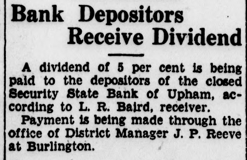 Bank Depositors Receive Dividend A dividend of 5 per cent is being paid to the depositors of the closed Security State Bank of Upham, according to L. R. Baird, receiver. Payment is being made through the office of District Manager J. P. Reeve at Burlington.