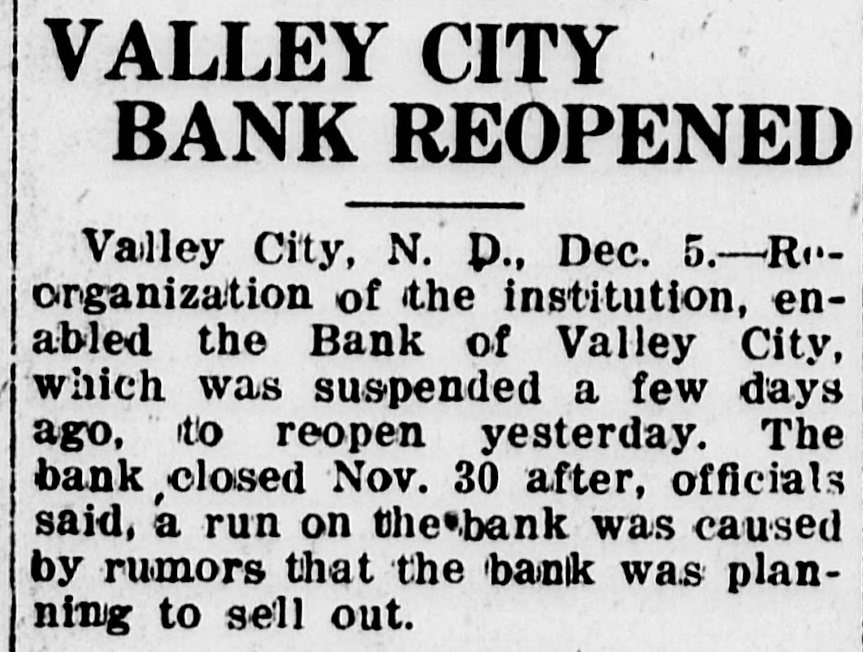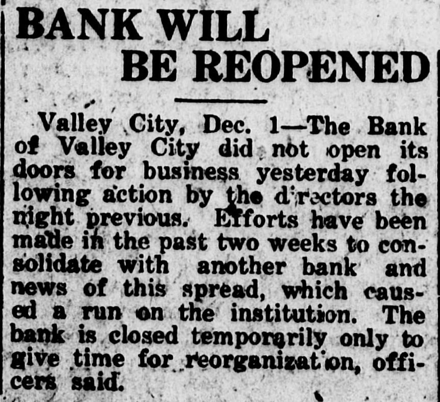 BANK WILL BE REOPENED Valley City, Dec. 1-The Bank of Valley City did not open its doors for business yesterday following action by the directors the night previous. Efforts have been made in the past two weeks to consolidate with another bank and news of this spread, which caused a run on the institution. The bank is closed temporarily only to give time for reorganization, officers said.