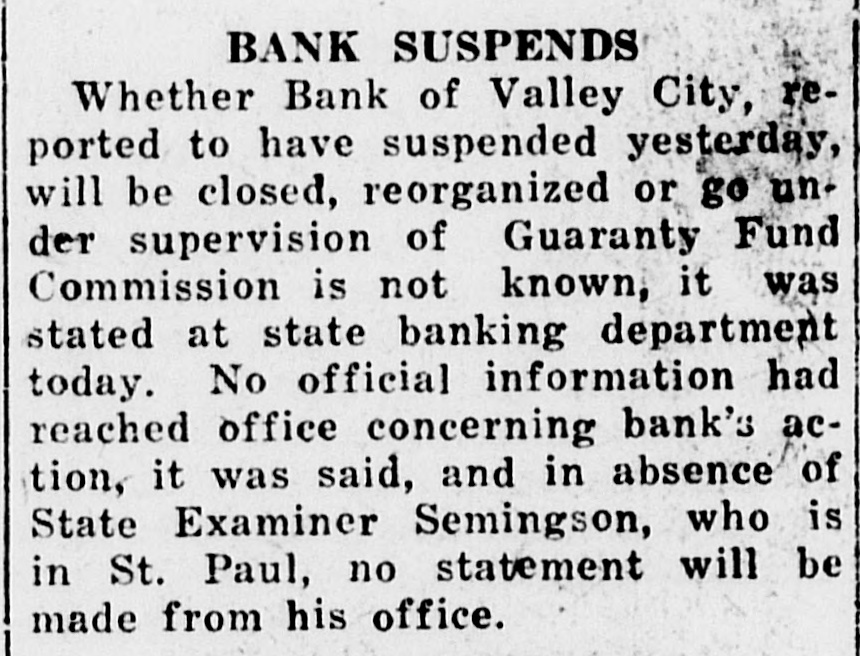 BANK SUSPENDS Whether Bank of Valley City, reported to have suspended yesterday, will be closed, reorganized or go under supervision of Guaranty Fund Commission is not known, it was stated at state banking department today. No official information had reached office concerning bank's action, it was said, and in absence of State Examiner Semingson, who is in St. Paul, no statement will be made from his office.
