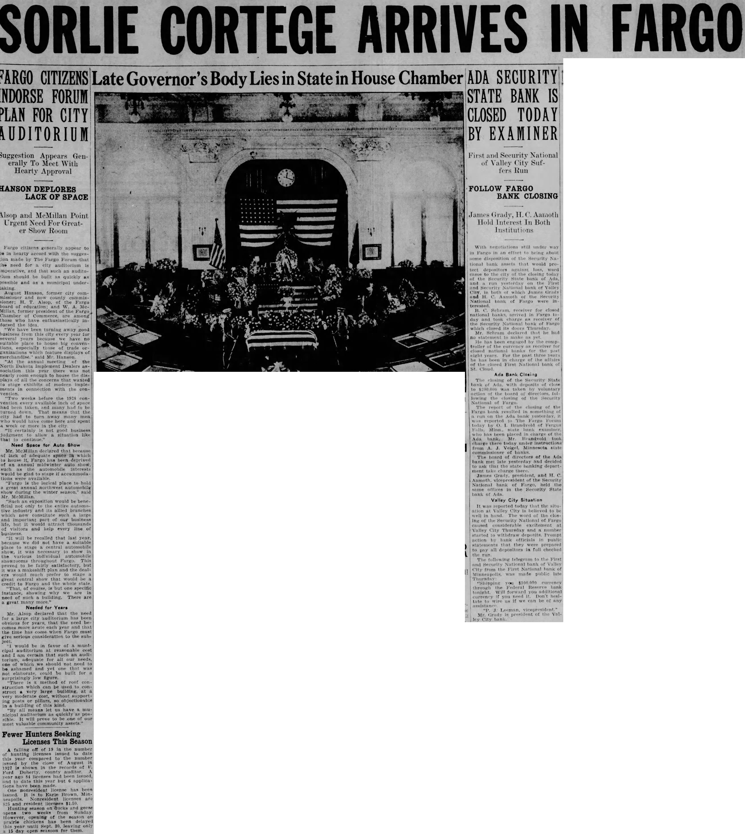 SORLIE CORTEGE ARRIVES IN FARGO FARGO CITIZENS ADA SECURITY Late Governor's Body Lies in State in House Chamber INDORSE FORUM STATE BANK IS PLAN FOR CITY CLOSED TODAY AUDITORIUM BY Suggestion Appears Generally To Meet With Hearty Approval HANSON DEPLORES LACK OF SPACE Alsop and McMillan Point Urgent Need For Greater Show Room Fargo citizens generally appear to be in hearty accord with the suggestion made by The Fargo Forum that the need for city auditorium is imperative, and that such an auditorlum should be built as quickly as possible and as a municipal undertaking. August Hanson, former city commissioner and county commissioner; H. Alsop, of the Fargo board of and W. McMillan, president the Fargo Chamber of Commerce, among those who have enthusiastically indorsed the "We have been turning away good business from this city every year for several years we have suitable place house big tions, those of trade ganizations which displays of said Mr. Hanson. the annual meeting the North Dakota Implement Dealers sociation this year there was not nearly enough to house the displays of all the that wanted ments in connection with the convention. weeks before the 1928 convention every available inch of space had and many had to be turned That means that the city had turn men have here and spent week in the city certainly not good business judgment allow a situation like that to continue." Need Space for Auto Show Mr. that because of lack of adequate space in to house it, Fargo has been deprived of an annual midwinter auto show such as automobile interests would be glad stage if accommodaavailable. "Fargo is the logical place to hold a great annual northwest automobile show during the winter said Mr. "Such an exposition would be beneficial not only to the entire automotive industry and its allied branches such large and important part of business life, but It of visitors and help every line of business. will be recalled that last year. because we did not have suitable place to stage central automobile show, it necessary to show in the various individual automobile throughout Fargo. This proved to be fairly satisfactory, but was makeshift plan and the dealers would much prefer to stage great show that would be credit to and the whole state "That, of but one specific instance, why we are need such building. There are a great Needed for Years Mr. Alsop declared that the need auditorium been obvious for years, that the need becomes more acute each year and that the time has come when Fargo must serious consideration to the subject. would be in favor of a muntcipal cost am certain that such an auditorlum, adequate for all our needs, one of which should not need to be ashamed and yet one was not elaborate, could be built for surprisingly low figure. method of roof construction which can construct very large building, at very moderate cost, without supporting posts or pillars, so objectionable in building of this kind. "By all means let us have a municipal auditorium as quickly as poswill prove to one our most valuable community assets." Fewer Hunters Seeking Licenses This Season A falling off of 19 in the number hunting licenses issued to date this year compared to the number issued by the close of August 1927 is shown in the records of Ford Doherty. county auditor ago 84 had issued, and date this year but applicaOne nonresident license has been Issued. It is to Earle Brown, MinNonresident licenses are $25 and resident licenses $1.50 Hunting season on and geese opens two from Sunday However, opening of the season on prairie chickens has been delayed year until Sept. 30. leaving only 15 day open seasoon for them. First and Security National of Valley City Suffers Run FOLLOW FARGO BANK CLOSING James Grady, H.C. Aamoth Hold Interest In Both Institutions With negotiations still under way in Fargo in an effort bring about some disposition of the Security tional bank assets that would protect depositors against loss, word the city of the closing today the Security State bank of and yesterday the First and Security National bank of Valley in both of which James Grady and the Security National bank of Fargo were in B. receiver for closed national banks, arrived in Fargo and took charge receiver of the Security National bank of Fargo which closed its doors Mr. Schram he make yet. has been engaged by the comptroller of the currency as for closed national banks for the eight years. For the past three of the affairs the closed First National bank of St. Ada Bank Closing The closing of the State bank of with of close to was by voluntary action of the board of directors, fol. lowing the closing of the Security National of The report of closing of the Fargo bank in something on the Ada yesterday was Forum today by Brandvold of Fergus state bank has been placed in charge of the Ada bank. Mr. Brandvold took charge today from A. Veigel, state banks. The hoard of directors of the Ada bank met late and decided to ask that the state banking department there. James Grady. president, and H. C. Anmoth. vicepresident of the Security National bank of Fargo, held the in the Security State bank of Valley City Situation It was reported today that the situ ation at Valley City to be well in The word of the ing of the Security National of Fargo caused at Valley City Thursday and number started Prompt action bank officials in public statements that they prepared to pay all depositors in full checked the The following telegram to the First and Security National bank of Valley City from the First National was made public late Thursday "Shipping you currency through the Federal Reserve bank tonight. forward you additional If need Don't heslcurrency you tate to wire we can be of any of the ley City
