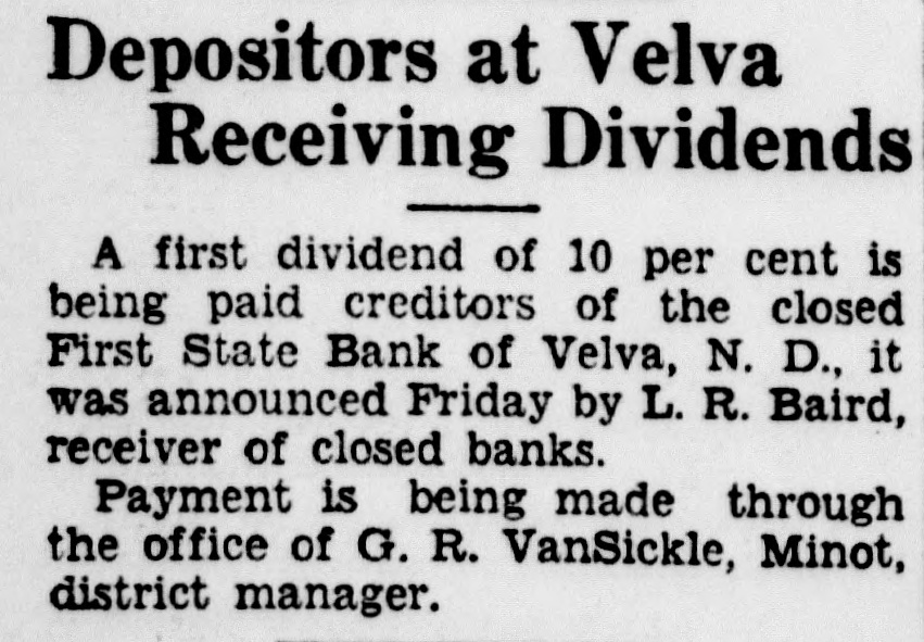Depositors at Velva Receiving Dividends A first dividend of 10 per cent is being paid creditors of the closed First State Bank of Velva, N. D., it was announced Friday by L. R. Baird, receiver of closed banks. Payment is being made through the office of G. R. VanSickle, Minot, district manager.