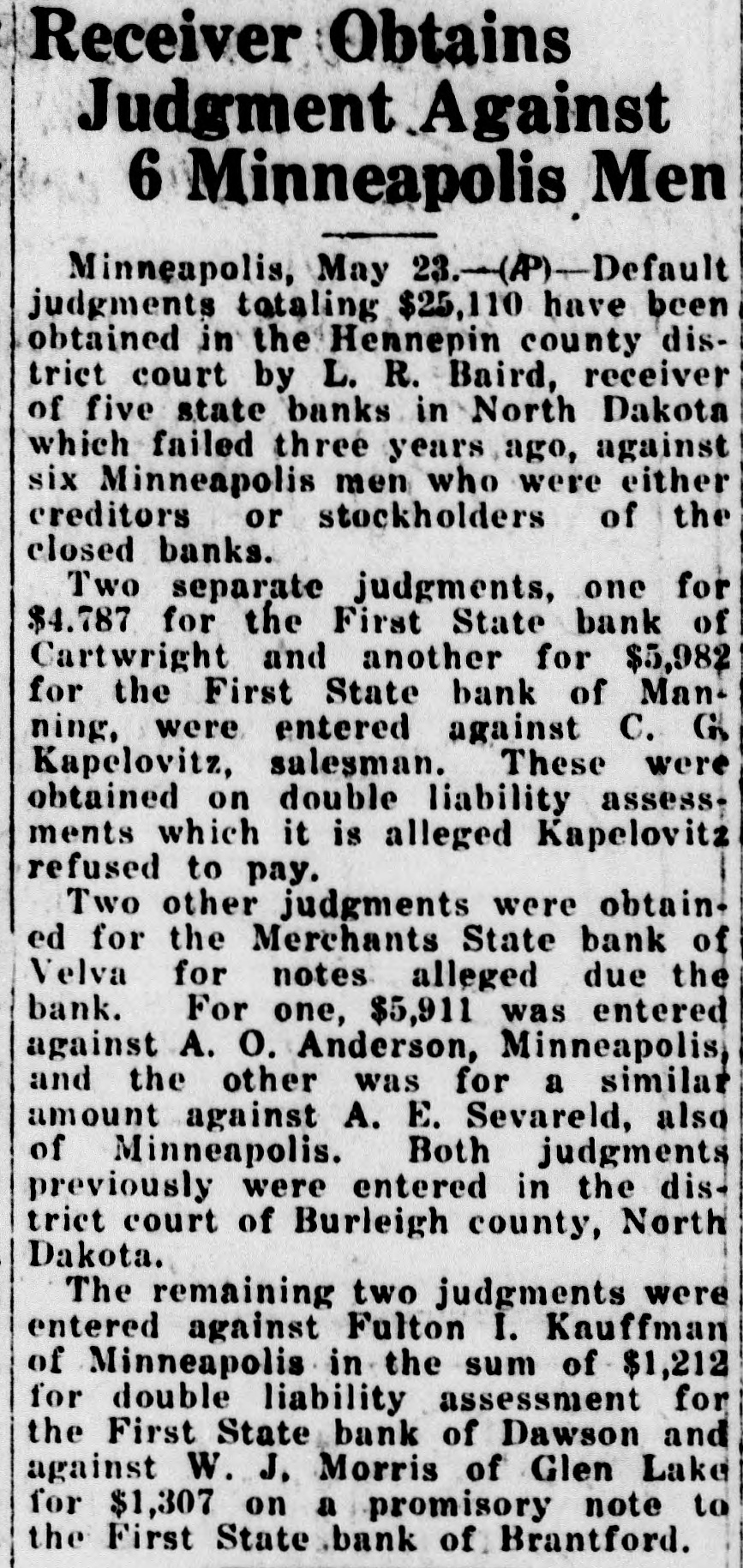 L. R. Baird, as Receiver of the Merchants State Bank, Velva, N. D., a corporation, Respondent.