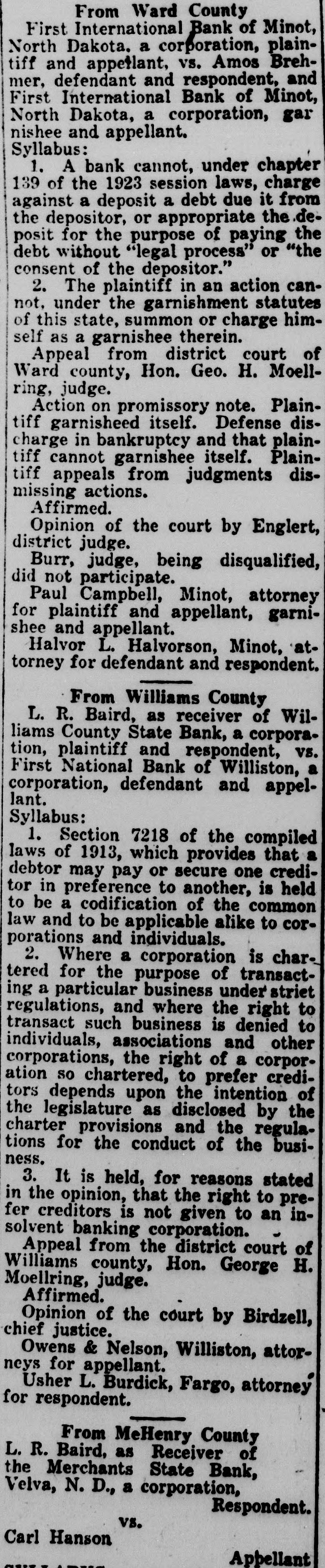 First International Bank of Minot, North Dakota, a corporation, plaintiff and appellant, vs. Amos Brehmer, defendant and respondent, and First International Bank of Minot, North Dakota, a corporation, garnishee and appellant.