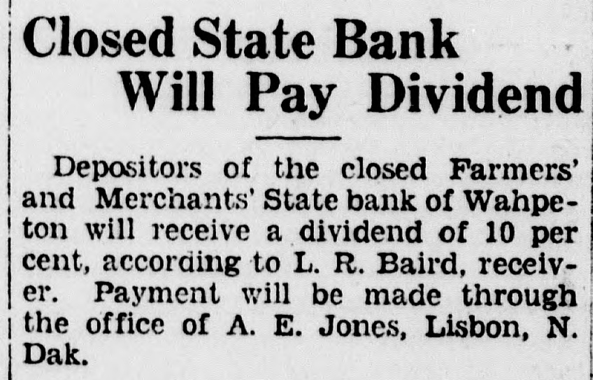 Closed State Bank Will Pay Dividend Depositors of the closed Farmers' and Merchants' State bank of Wahpeton will receive a dividend of 10 per cent, according to L. R. Baird, receiver. Payment will be made through the office of A. E. Jones, Lisbon, N. Dak.