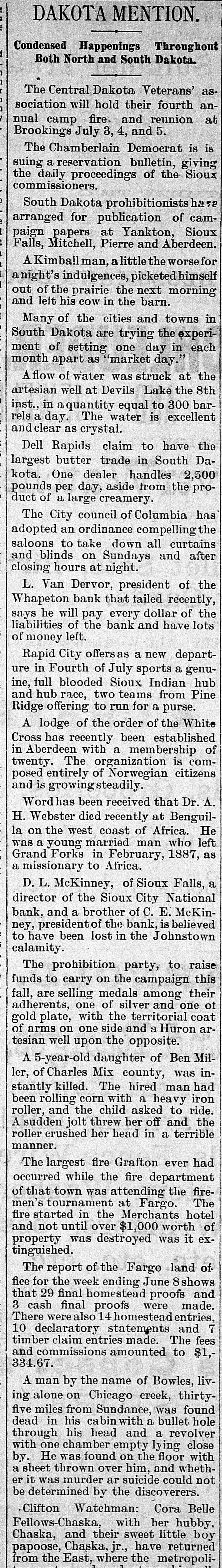 # DAKOTA MENTION. Condensed Happenings Throughout Both North and South Dakota. The Central Dakota Veterans' association will hold their fourth annual camp fire. and reunion at Brookings July 3, 4, and 5. The Chamberlain Democrat is is suing a reservation bulletin, giving the daily proceedings of the Sioux commissioners. South Dakota prohibitionists hare arranged for publication of campaign papers at Yankton, Sioux Falls, Mitchell, Pierre and Aberdeen. A Kimball man, a little the worse for a night's indulgences, picketed himself out of the prairie the next morning and left his cow in the barn. Many of the cities and towns in South Dakota are trying the experiment of setting one day in each month apart as "market day." A flow of water was struck at the artesian well at Devils Lake the 8th inst., in a quantity equal to 300 barrels a day. The water is excellent and clear as crystal. Dell Rapids claim to have the largest butter trade in South Dakota. One dealer handles 2,500 pounds per day, aside from the product of a large creamery. The City council of Columbia has adopted an ordinance compelling the saloons to take down all curtains and blinds on Sundays and after closing hours at night. L. Van Dervor, president of the Whapeton bank that tailed recently, says he will pay every dollar of the liabilities of the bank and have lots of money left. Rapid City offers as a new departure in Fourth of July sports a genuine, full blooded Sioux Indian hub and hub race, two teams from Pine Ridge offering to run for a purse. A lodge of the order of the White Cross has recently been established in Aberdeen with a membership of twenty. The organization is composed entirely of Norwegian citizens and is growing steadily. Word has been received that Dr. A. H. Webster died recently at Benguilla on the west coast of Africa. He was a young married man who left Grand Forks in February, 1887, as a missionary to Africa. D. L. McKinney, of Sioux Falls, a director of the Sioux City National bank, and a brother of C. E. McKinney, president of the bank, is believed to have been lost in the Johnstown calamity. The prohibition party, to raise funds to carry on the campaign this fall, are selling medals among their adherents, one of silver and one of gold plate, with the territorial coat of arms on one side and a Huron artesian well upon the opposite. A 5-year-old daughter of Ben Miller, of Charles Mix county, was instantly killed. The hired man had been rolling corn with a heavy iron roller, and the child asked to ride. A sudden jolt threw her off and the roller crushed her head in a terrible manner. The largest fire Grafton ever had occurred while the fire department of that town was attending the firemen's tournament at Fargo. The fire started in the Merchants hotel and not until over $1,000 worth of property was destroyed was it extinguished. The report of the Fargo land office for the week ending June 8 shows that 29 final homestead proofs and 3 cash final proofs were made. There were also 14 homestead entries. 10 declaratory statements and 7 timber claim entries made. The fees and commissions amounted to $1,334.67. A man by the name of Bowles, living alone on Chicago creek, thirty-five miles from Sundance, was found dead in his cabin with a bullet hole through his head and a revolver with one chamber empty lying close by. He was found on the floor with a sheet thrown over him, and whether it was murder ar suicide could not be determined by the discoverers. Clifton Watchman: Cora Belle Fellows-Chaska, with her hubby, Chaska, and their sweet little boy papoose, Chaska, jr., have returned from the East, where the metropoli-