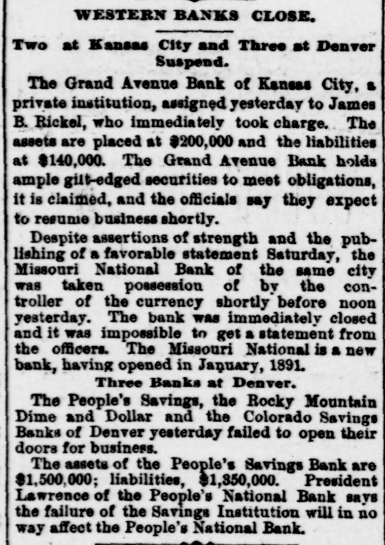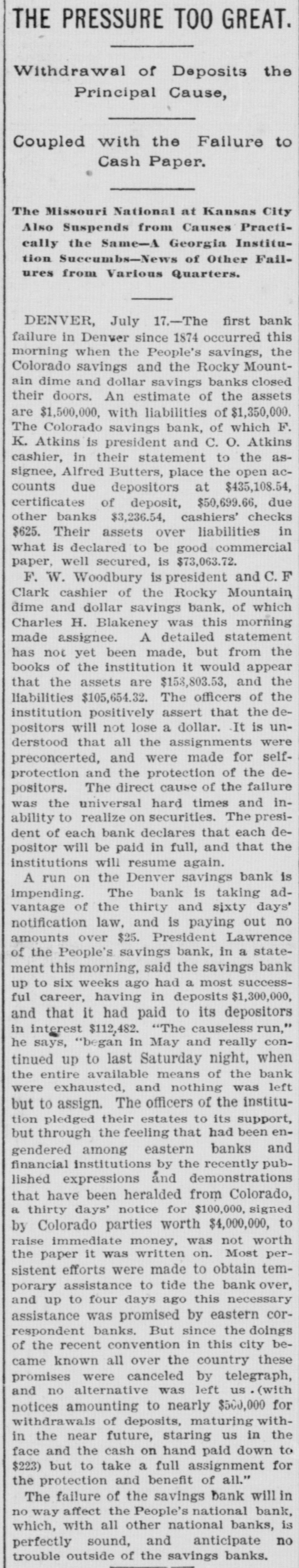 TELEGRAPHIC BREVITIES. Thos. Walsh, president of the University of Notra Dame, South Bend, Ind., died there to-day. The President left Gray Gables today for a cruise. It is possible he may be bound for New York. Fannie Post, an attractive young lady of Schuyler, Neb., is thought to be held a prisoner by tramps on an island in the Platte river. Two persons were killed and four seriously injured last night by the premature explosion of a fireworks bomb at an Italian picnic near Chicago. Frank Beebe, a son of J. Arthur Beebe, member of the Boston family of millionaires, was drowned in Buzzards Bay last night by the capsizing of his boat. A disease over which the doctors are in dispute, has raged with considerable violence in Anaconda, Mont., for the last ten weeks. It is alternately called black measels and black smallpox. Admiral Wadenkolk is a prisoner and is now on his way to Rio Janeiro under a heavy guard. He has been declared to be a traitor and will no doubt be executed without much ceremony. Anna Witkower, who was until last Sunday a chambermaid at the Palmer House in Chicago, is baroness Sohlbern, wife of of a millionaire Austrian nobleman. The couple were married on Saturday. A posse has been searching since Saturday night in and around Brierfield, Ala., for a negro who, it is reported, shot and killed two women. The belief is general that the negro was last night captured and lynched. William Baxter, of Holden, Mass., was found murdered in a cow pasture yesterday afternoon. The skull was fractured in two places. A hatchet was found near the body and a long handled axe was at the side of the dead man. Goveronor Altgeld, of Illinois, is preparing, according to a statement made by a friend, an exhaustive review of the anarchist case which will be a genuine "roast" for those who secured their conviction. He will reaffirm that the men were bribed by a prejudiced judge and by a jury selected to convict. John Meyers escaped from the State hospital for the insane in Utica, N. Y., this morning and proceeding to his wife's home, murderously assaulted her with a club. Her screams attracted the attention of a neighbor who bravely tackled Meyers and the wife escaped. Meyers then rushed back into the house and cut his throat with 8 razor. It is not believed that the injuries of either will prove fatal. A young girl who was employed as a domestic at a boarding house and George B. Frame, a border at the same place, were struck by a train on the Rome, Watertown and Ogdensburg railroad while they were attempting to cross a railroad bridge on the outskirts of Watertown, N. Y., last night. The girl's body was mangled horriby and the man's skull was crushed. Both died immediately. The five-mile road race of the Calumet Cycling Club at Chicago Saturday afternoon resulted in breaking the American road record for the distance. A. L. Leonhardt did the trick in 13:30, beating the former record by eight seconds. The People's Savings, the Rocky Mountain Dime and Dollar and the Colorado Savings Banks at Denver, failed to open their doors for business this morning. The Bank of Grand Avenue and the Missouri National Bank at Kansas City suspended -day. The Duplex Company of New York assigned to-day.