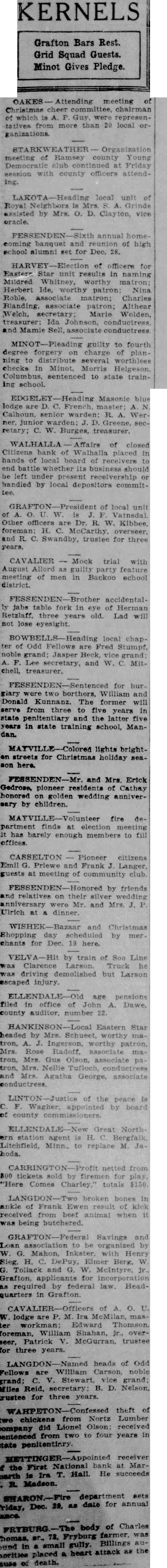 KERNELS Grafton Bars Rest. Grid Squad Guests. Minot Gives Pledge. Attending meeting of Christmas chairman which Guy, were representatives 20 local or- meeting Ramsey Young Democratic continued at Friday county officers attending. local unit Royal Neighbors Grinde assisted by Mrs. O. Clayton, annual banquet and of high school alumni set for Dec. 28. of officers for Eastern results in naming Mildred Whitney, worthy Herbert Ide, worthy Nina Roble, associate matron: Charles Blanding associate patron; Althear secretary: Marie Wolden, treasurer: Ida Johnson, conductress. and Mamie Sell associate guilty fourth charge of planning to distribute several checks in Minot, Morris Helgeson, Columbus, sentenced to state trainschool. Masonie blue lodge are French, master: Calhoun, senior warden: R. Wer. ner. junior warden: Greene, secretary: C. W. Burges, treasurer. Affairs of closed Citizens bank Walhalla placed in hands of local board of receivers to end battle whether business should left under receivership or handled by local depositors commit- of local unit W. Other officers are Dr. R. W. Kibbee, and R. Swandby, trustee for three years. CAVALIER Mock trial with August Allord as guilty party feature meeting of men in Backoo school district. accidentaljabs table fork in eye of Herman Retzlaff, three years old. Lad will not lose local chapter Odd Fellows are Fred Stumpf. noble grand: Jasper Beck, vice grand: Lee secretary, and Mitchell, treasurer. for burgiary two borthers, William and Donald Kunnanz. The former will serve from three to five years In state penitentiary and the latter five years in state training school, Mandan. lights brightstreets for Christmas holiday son here. FESSENDEN-Mr. and Mrs Erick Gedrose, pioneer residents of Cathay honored on golden wedding annivereary by children. fire department finds at election meeting has barely enough members to fill CASSELTON Pioneer citizens Emil Priewe and Frank Langer guests at meeting of community club. FESSENDEN-Honored by friends and relatives on their silver wedding anniversary were Mr. and Mrs. Ulrich at dinner. and Christmas Shopping day by mer chants for Dec. 19 here. by train of Soo Line Clarence Larson. Truck driving demolished but Larson escaped injury. age pensions filed in office of John A. Dawe, county auditor, number 22. Eastern Star headed by Mrs. Schueet, worthy matron, Ingerson, worthy Mrs. Rose associate tron, Mrs Gus Olson, associate tron, Mrs. Nellie Tufloch, conductress and Mrs. Agatha George, associate conductress of the peace is C. Wagher, appointed by board of county commissioners. Great North ern agent Bergfalk, Litchfield, Minn., to replace M. Ja. netted from 800 tickets sold by firemen for play "Here Comes Charley,' totals $150 broken bones in ankle of Frank Ewen result of klck from beef animal when was being butchered. Savings and Loan association organized by G. Mahon, Henry Sieg. H. DePuy, Elmer Berg, W G. Tollack and G. W. McIntyre, Grafton, for incorporation required by federal law. Headquarters in Grafton. of A. O. U. W. lodge Ira McMilan, master workman: Edward Thomson, foreman, William Shahan, overseer, Patrick McGurran, trustee for three years. heads of Odd Fellows are William Carson, noble Miles Reid, secretary: B. D. Nelson, trustee for three WAHPETON-Confessed theft of two chickens from Nortz Lumber company did Lionel Olson: received sentenced from two to four years in state penitentiary receiver the First National bank at MarIra T. He succeeds R. Madson. department sets date for annual Dec. of Fryburg farmer, Billings in small attack the placed heart death.