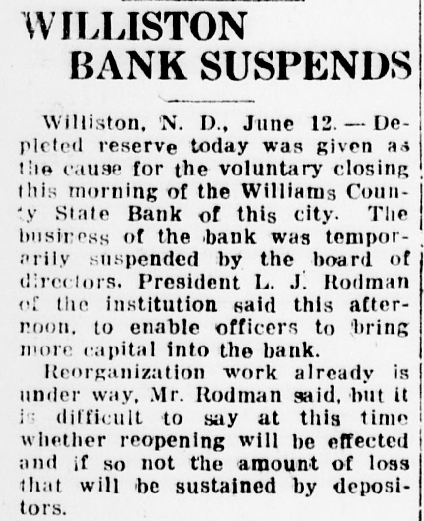 WILLISTON BANK SUSPENDS Williston, N. D., June 12. ---- Depleted reserve today was given as the cause for the voluntary closing this morning of the Williams County State Bank of this city. The business of the bank was temporarily suspended by the board of directors. President L. J. Rodman of the institution said this afternoon. to enable officers to bring more capital into the bank. Reorganization work already is under way, Mr. Rodman said, but it is difficult to say at this time whether reopening will be effected and if so not the amount of loss that will be sustained by depositors.