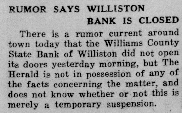 RUMOR SAYS WILLISTON BANK IS CLOSED There is a rumor current around town today that the Williams County State Bank of Williston did not open its doors yesterday morning, but The Herald is not in possession of any of the facts concerning the matter, and does not know whether or not this is merely a temporary suspension.