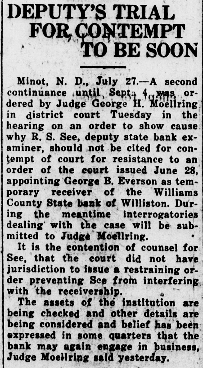 DEPUTY'S TRIAL FOR, CONTEMPT TO BE SOON Minot, N. D., July 27.-A second continuance until, Sept. 4 09113 was ordered by Judge George H. Moellring in district court Tuesday in the hearing on an order to show cause why R. S. See, deputy state bank examiner, should not be cited for contempt of court for resistance to an order of the court issued June 28, appointing George B. Everson as temporary receiver of the Williams County State bank of Williston. During the meantime interrogatories dealing with the case will be submitted to Judge Moellring. It is the contention of counsel for See, that the court did not have jurisdiction to issue a restraining order preventing See from interfering with the receivership. The assets of the institution are being checked and other details are being considered and belief has been expressed in some quarters that the bank may again engage in business, Judge Moellring said yesterday.