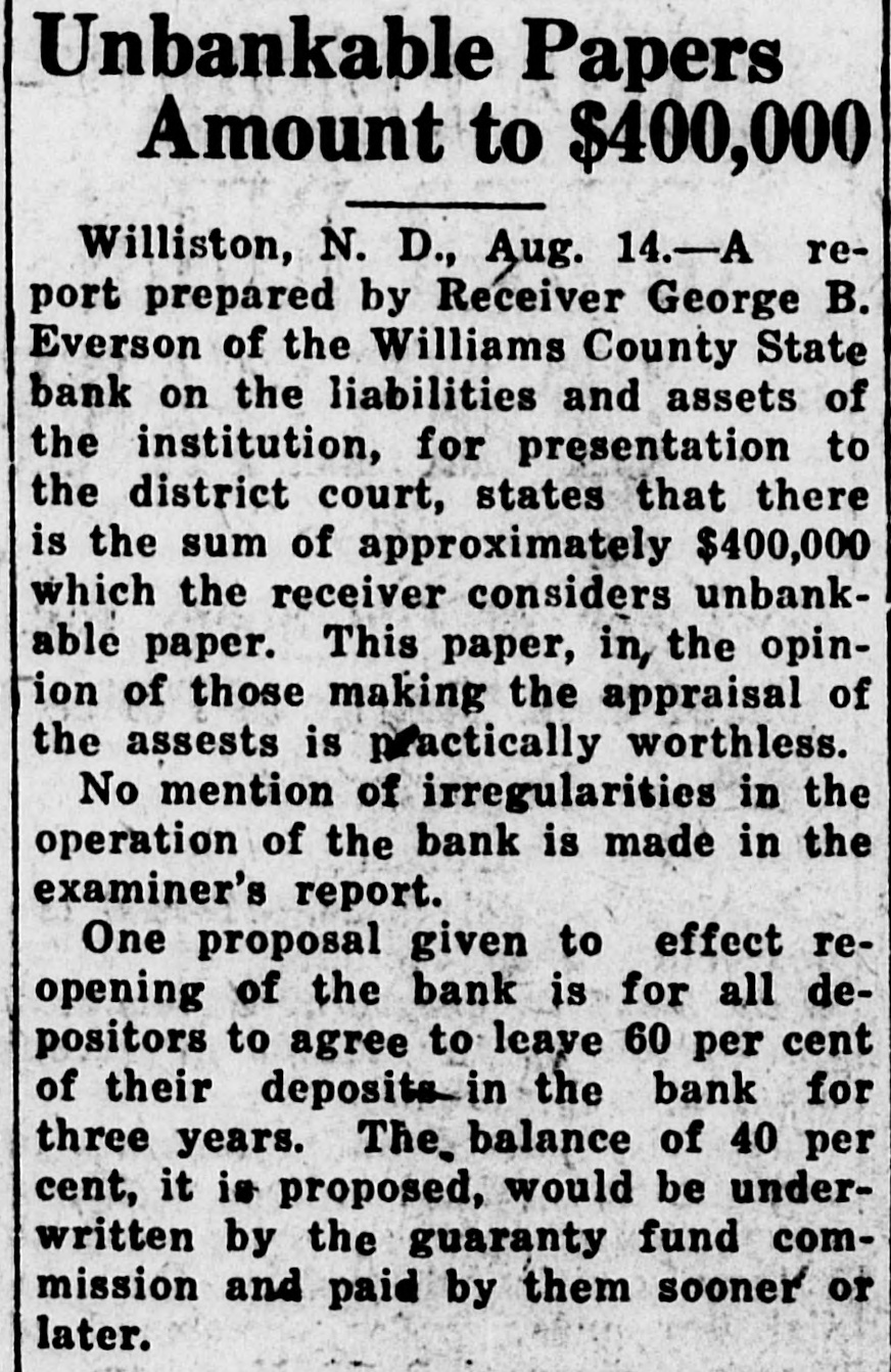 Unbankable Papers Amount to $400,000 Williston, N. D., Aug. 14.-A report prepared by Receiver George B. Everson of the Williams County State bank on the liabilities and assets of the institution, for presentation to the district court, states that there is the sum of approximately $400,000 which the receiver considers unbankable paper. This paper, in, the opinion of those making the appraisal of the assests is practically worthless. No mention of irregularities in the operation of the bank is made in the examiner's report. One proposal given to effect reopening of the bank is for all depositors to agree to leave 60 per cent of their deposits. in the bank for three years. The. balance of 40 per cent, it is proposed, would be underwritten by the guaranty fund commission and paid by them sooner or later.