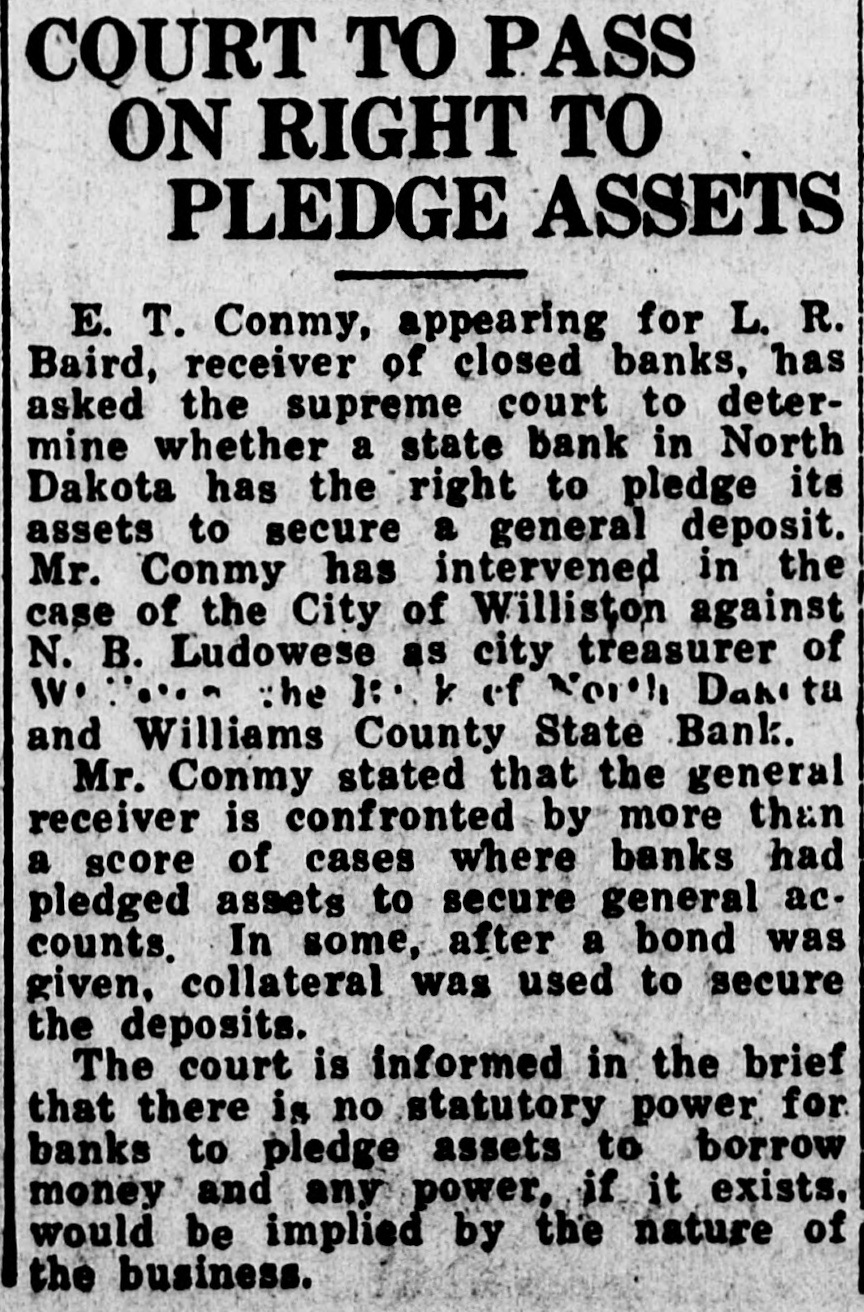 COURT TO PASS ON RIGHT TO PLEDGE ASSETS E. T. Conmy, appearing for L. R. Baird, receiver of closed banks, has asked the supreme court to determine whether a state bank in North Dakota has the right to pledge its assets to secure a general deposit. Mr. Conmy has intervened in the case of the City of Williston against N. B. Ludowese as city treasurer of IV. he }: V. of Dahita and Williams County State Bank. Mr. Conmy stated that the general receiver is confronted by more than a score of cases where banks had pledged assets to secure general accounts. In some, after a bond was given, collateral was used to secure the deposits. The court is informed in the brief that there is no statutory power for banks to pledge assets to borrow money and any power, if it exists. would be implied by the nature of the business.