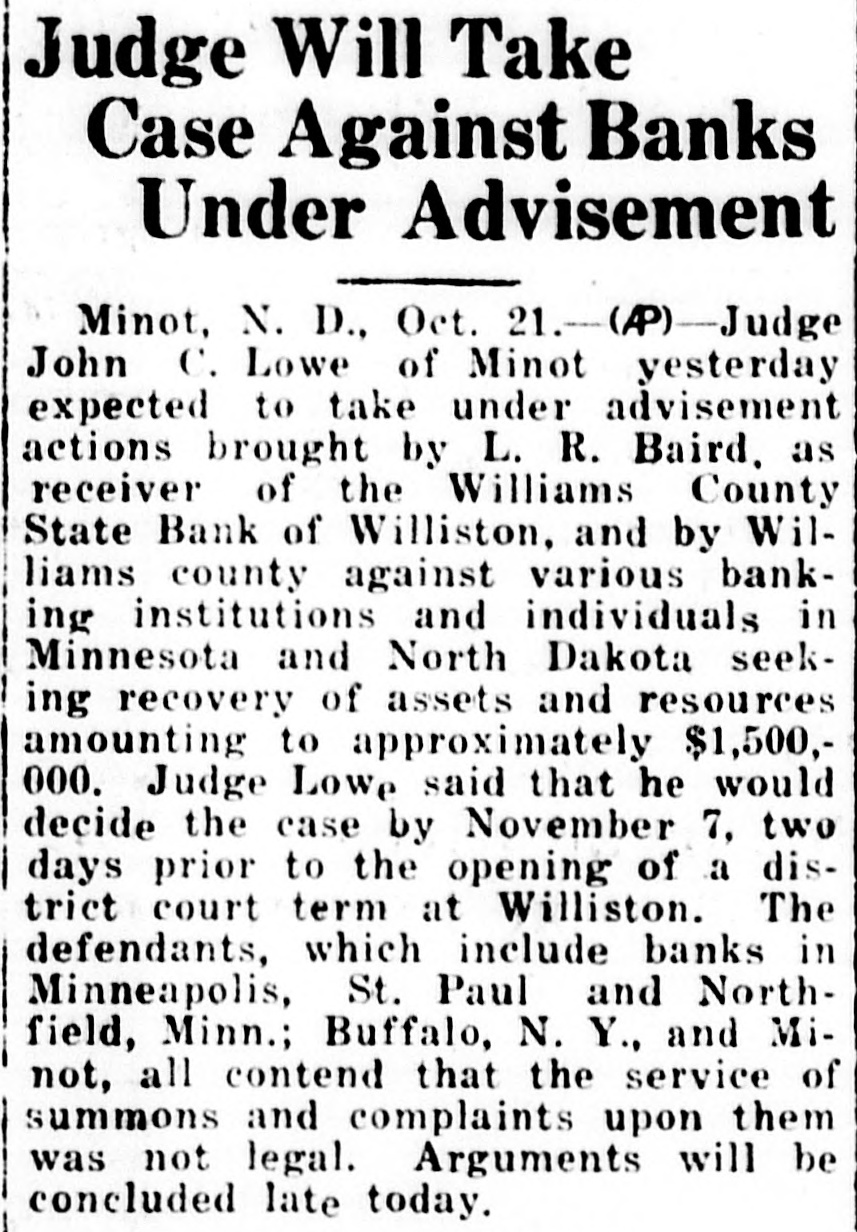 Judge Will Take Case Against Banks Under Advisement Minot, N. D., Oct. 21.-(P)-Judge John C. Lowe of Minot yesterday expected to take under advisement actions brought by L. R. Baird. as receiver of the Williams County State Bank of Williston, and by Williams county against various banking institutions and individuals in Minnesota and North Dakota seeking recovery of assets and resources amounting to approximately $1,500,000. Judge Lowe said that he would decide the case by November 7, two days prior to the opening of a district court term at Williston. The defendants, which include banks in Minneapolis, St. Paul and Northfield, Minn.; Buffalo, N. Y., and Minot, all contend that the service of summons and complaints upon them was not legal. Arguments will be concluded late today.