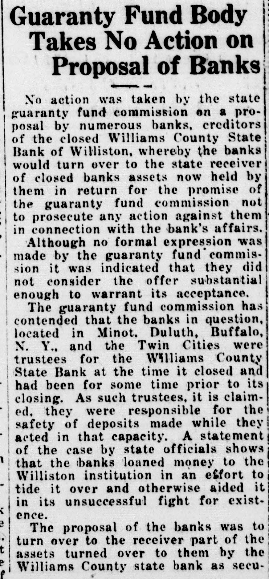 Guaranty Fund Body Takes No Action on Proposal of Banks No action was taken by the state guaranty fund commission on a proposal by numerous banks, creditors of the closed Williams County State Bank of Williston, whereby the banks would turn over to the state receiver of closed banks assets now held by them in return for the promise of the guaranty fund commission not to prosecute any action against them in connection with the bank's affairs. Although no formal expression was made by the guaranty fund commission it was indicated that they did not consider the offer substantial enough to warrant its acceptance. The guaranty fund commission has contended that the banks in question, located in Minot. Duluth, Buffalo, N. Y., and the Twin Cities were trustees for the Williams County State Bank at the time it closed and had been for some time prior to its closing. As such trustees, it is claimed, they were responsible for the safety of deposits made while they acted in that capacity. A statement of the case by state officials shows that the banks loaned money to the Williston institution in an effort to tide it over and otherwise aided it in its unsuccessful fight for existence. The proposal of the banks was to turn over to the receiver part of the assets turned over to them by the Williams County state bank as secu-