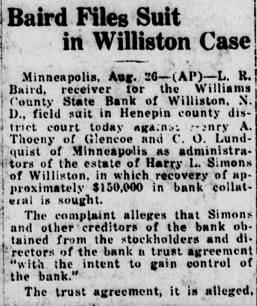 Baird Files Suit in Williston Case Minneapolis, Aug. 26-(AP)-L. R. Baird, receiver for the Williams County State Bank of Williston. N. D., field suit in Henepin county district court today against menry A. Thoeny of Glencoe and C. O. Lundquist of Minneapolis as administrators of the estate of Harry L. Simons of Williston, in which recovery of approximately $150,000 in bank collateral is sought. The complaint alleges that Simons and other creditors of the bank obtained from the stockholders and directors of the bank a trust agreement "with the intent to gain control of the bank." The trust agreement, it is alleged,