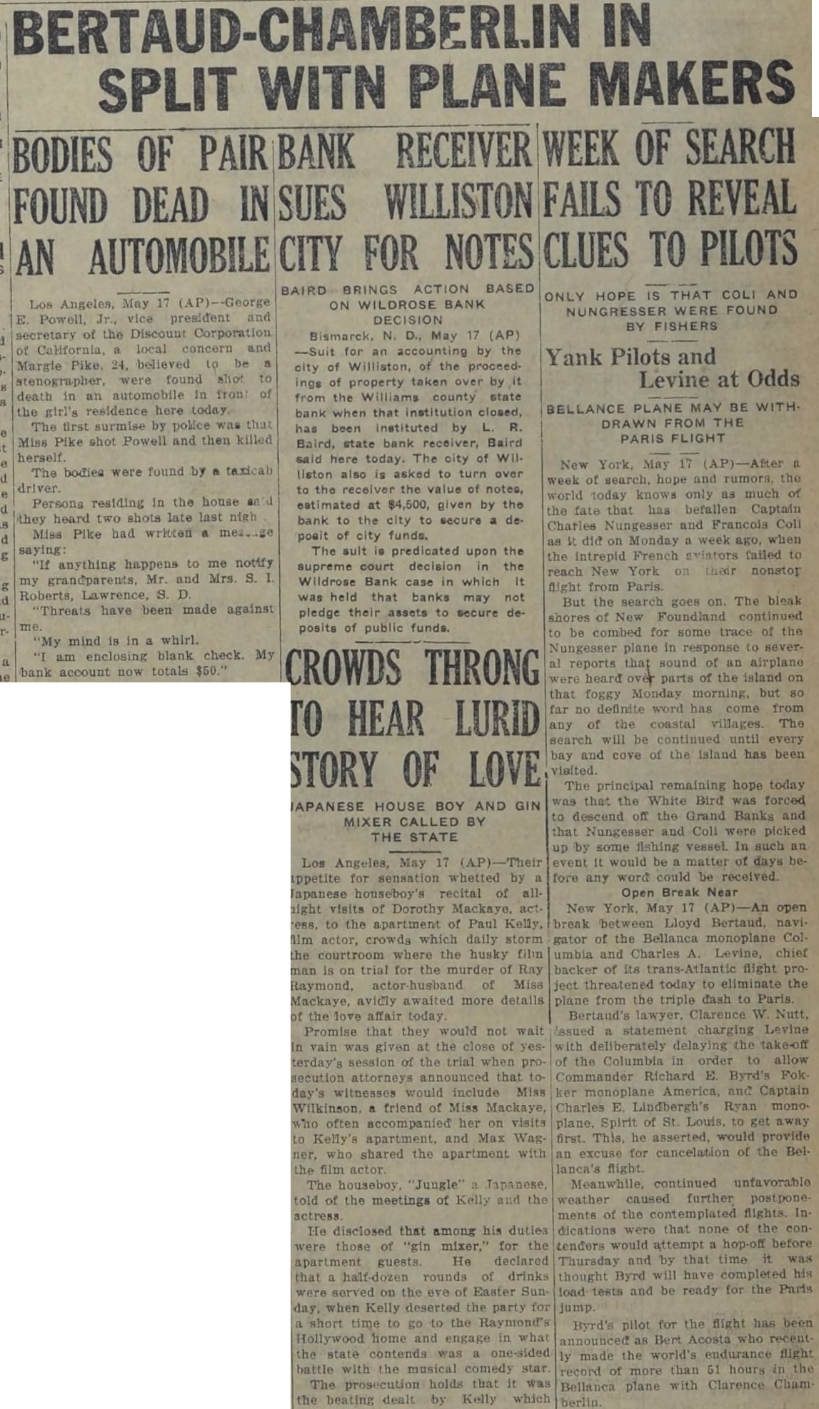 New May week search, hope and rumors, the world today knows only as much of the fate that has befallen Captain Charles Nungesser and Francols Coll did on Monday week ago, when the intrepid French aviators failed to reach New York on their nonstor flight from Paris. But the search goes on. The bleak shores of New Foundland continued be combed for some trace of the Nungesser plane in response to severreports that sound of an airplane parts of the island on that foggy Monday morning, but far no definite word has come from any of the coastal villages. The search will be continued until every and cove the island has been visited. The principal remaining hope today was that the White Bird was forced descend off the Grand Banks and that Nungesser and Coli were picked up by some fishing vessel. In such an event It would be matter of days before any word could be received. Open Break Near New York, May 17 open break Lloyd Bertaud, navigator of the Bellanca monoplane Col. umbia and Charles Levine, chief backer of its flight pro ject threatened today to eliminate the plane from the triple dash to Paris. Bertaud's lawyer, Clarence W. Nutt, issued statement charging Levine deliberately delaying the take-off of the Columbia order to allow Commander Richard Byrd's Fok monoplane America, and Captain Charles Lindbergh's Ryan monoplane, Spirit of Louis, to get away first. This, he asserted, would provide an excuse for cancelation of the Bel lanca's Meanwhile, continued unfavorable weather caused further postpone ments of the contemplated flights. In. dications were that none of the contenders would attempt hop-off before Thursday and by that time was thought Byrd will completed his load tests and be ready for the Paris jump. Byrd's pilot for the flight has been as Bert Acosta who recentmade the world's flight record of more than 51 hours the Bellanca plane with Clarence Cham