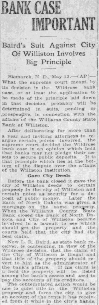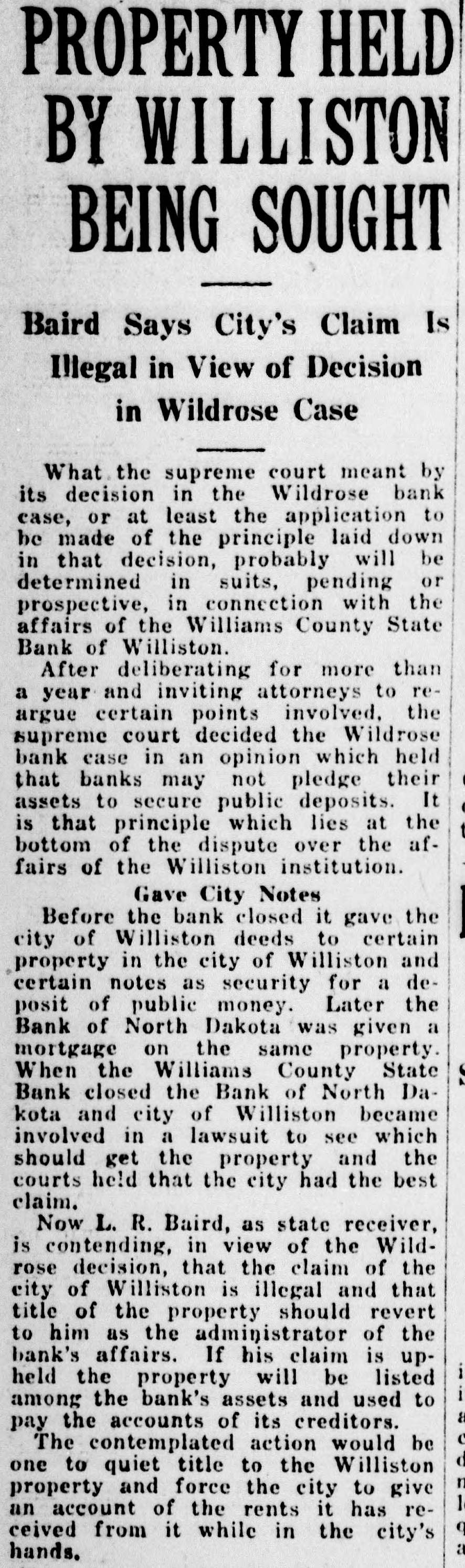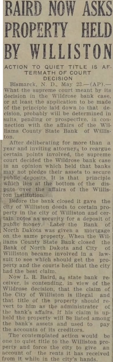 PROPERTY HELD BY WILLISTON BEING SOUGHT Baird Says City's Claim Is Illegal in View of Decision in Wildrose Case What the supreme court meant by its decision in the Wildrose bank case, or at least the application to be made of the principle laid down in that decision, probably will be determined in suits, pending or prospective, in connection with the affairs of the Williams County State Bank of Williston. After deliberating for more than a year and inviting attorneys to reargue certain points involved, the supreme court decided the Wildrose bank case in an opinion which held that banks may not pledge their assets to secure public deposits. It is that principle which lies at the bottom of the dispute over the affairs of the Williston institution. Gave City Notes Before the bank closed it gave the city of Williston deeds to certain property in the city of Williston and certain notes as security for a deposit of public money. Later the Bank of North Dakota was given a mortgage on the same property. When the Williams County State Bank closed the Bank of North Dakota and city of Williston became involved in a lawsuit to see which should get the property and the courts held that the city had the best claim. Now L. R. Baird, as state receiver, is contending, in view of the Wildrose decision, that the claim of the city of Williston is illegal and that title of the property should revert to him as the administrator of the bank's affairs. If his claim is upheld the property will be listed among the bank's assets and used to pay the accounts of its creditors. The contemplated action would be one to quiet title to the Williston property and force the city to give an account of the rents it has received from it while in the city's hands.