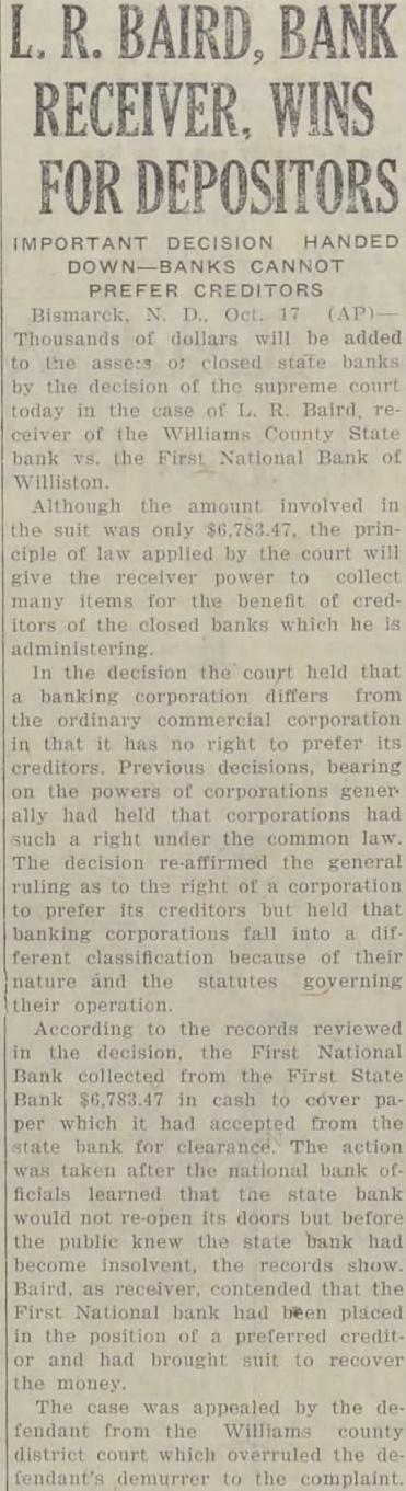 IMPORTANT DECISION HANDED CANNOT PREFER CREDITORS Bismarck, Oct. Thousands dollars will be added the asse:3 closed banks the decision the supreme today in the case of Baird of the Williams County State bank the National Bank of Williston Although the amount involved in suit was only the principle of law applied by court receiver power to collect many items for the benefit of creditors of the closed banks which he In the decision the court held that banking corporation differs from the ordinary commercial corporation in that it has no right to prefer its creditors. Previous decisions, bearing the powers of corporations gener ally had held that corporations had such right under the common law The decision re-affirmed the general ruling as to the right of a corporation prefer its creditors but held that banking corporations fall into dif ferent classification because of their nature and the statutes their operation to the records reviewed in the decision, the First National Bank collected from the First State Bank in cash to cóver per which had accepted from the bank for clearance The action taken after the national bank ficials learned that the state bank would re-open its doors but before the public knew the state bank had become insolvent, the records show Baird receiver, that the First National bank had been placed in the position preferred credit and had brought suit to recover the money. The appealed by the fendant from the Williams county which overruled the demurrer complaint